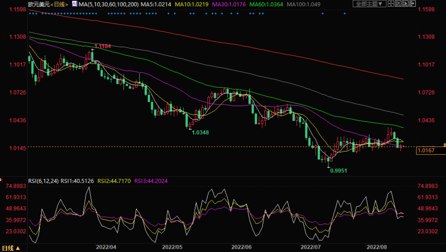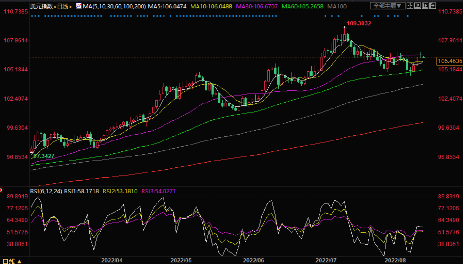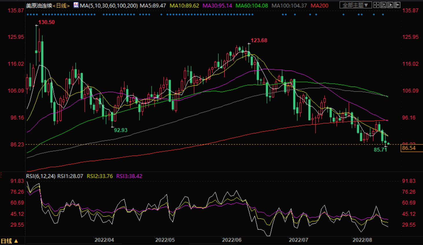 周三盘中,美元指数交投于106.50附近,投资者在等待美国零售销售数据和美联储会议记录,以寻找9月可能加息幅度的新信号,金价疲软;油价周二下跌近1%,盘中拉锯较大,一度触及半年新低85.71美元/桶,经济数据引发对全球经济可能陷入衰退的担忧,同时市场静待伊核协议出炉,可能会允许伊朗出口更多石油。