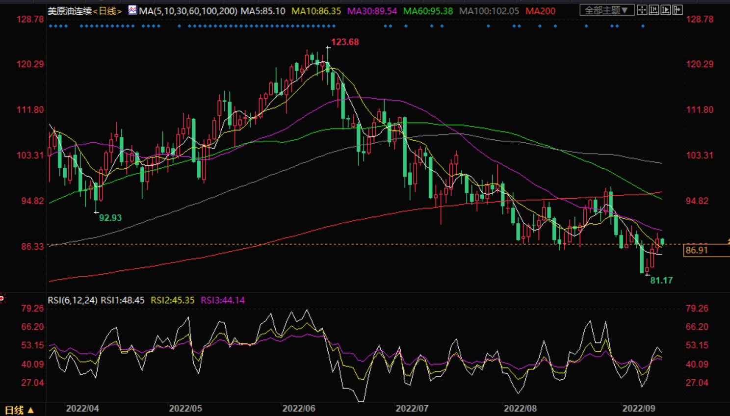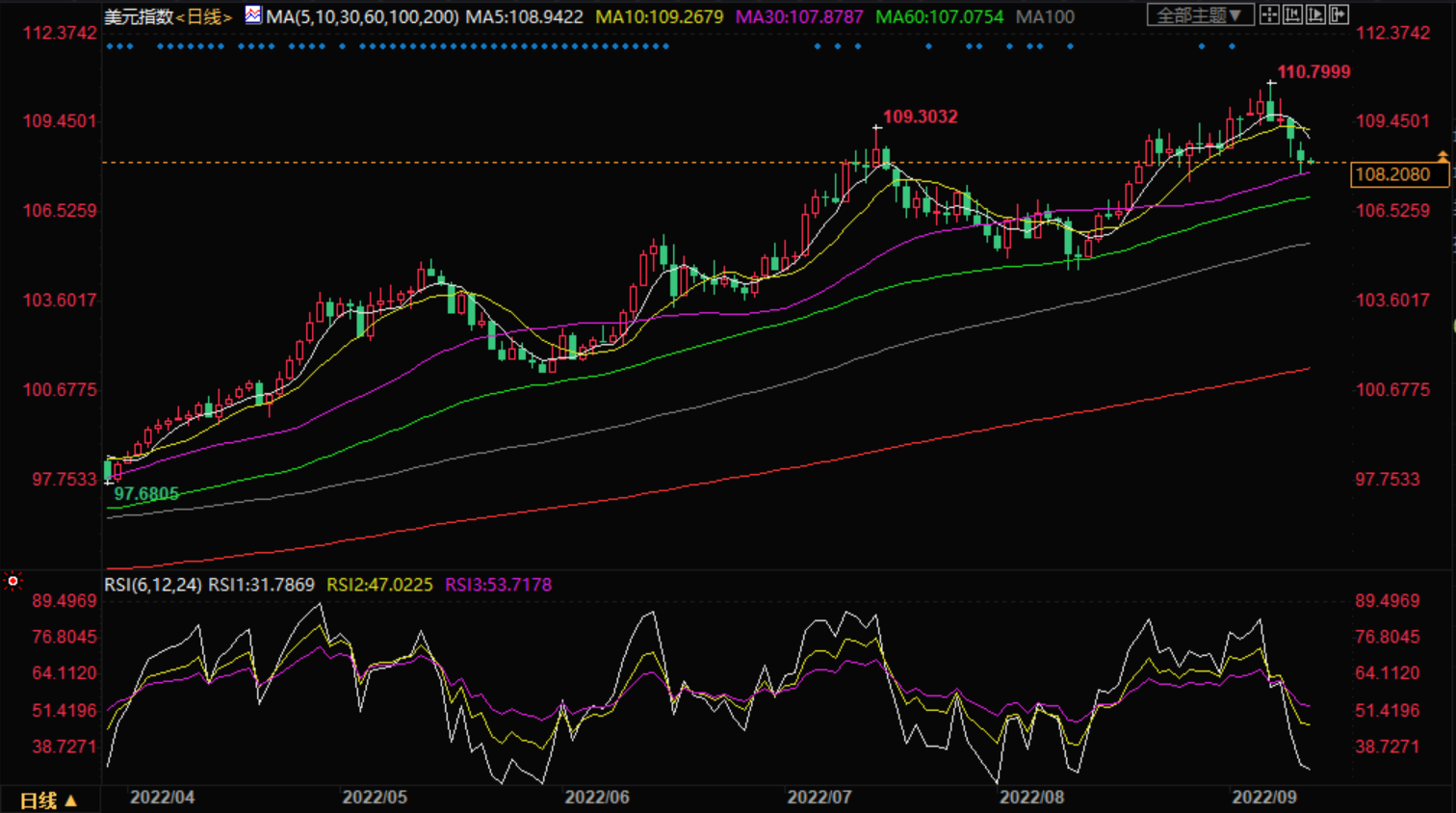 周二(9月13日)亚市早盘,美元指数交投于108.30附近;美元周一跌至两周多来的最低水平,因投资者在美国通胀数据公布前变得紧张,而且美国以外的央行似乎越来越鹰派的影响,受美元走软支撑,黄金跳涨约1%,白银涨超过5%,达到8月17日以来的最高;油价周一收高,摆脱需求预期疲软的影响,因为随着冬季临近,供应担忧加剧。美国能源部(DOE)周一公布的数据显示,截至9月9日的一周,美国战略石油储备库存下降840万桶,至4.341亿桶,为1984年10月以来的最低水平。
