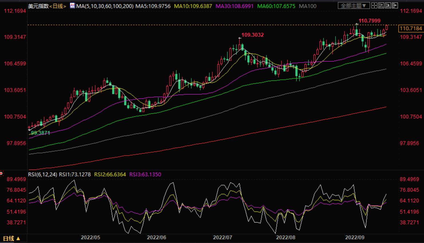 在美联储大幅加息的预期下,9月份以来,除了美元,全球几乎所有的风险资产都在下跌,美股、黄金、原油、虚拟货币,非美货币更是开启了持续下跌的模式。美元指数突破110点之后,正在区间震荡,人民币兑美元汇率也已经坐稳7整数关口,还在向下突破。