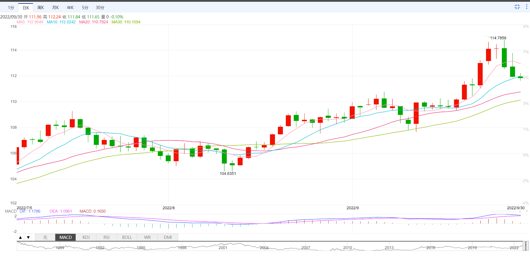美元指数:截止发稿,美元指数小幅上涨,现报112.14,涨幅0.15%。欧市盘前,美元指数暂时试图处在112.00上方。市场对美元指数的悲观预期尚未消散,美元回调可能已经结束,将延续下跌前景。美国第二季度国内生产总值(GDP)的最终数据证实了最初预测的-0.6%。值得注意的是,9月24日止,美国每周首次申请失业救济人数降至193K人,而前值为209K(由213K修正),市场预期为215K,这可能也对美元指数造成了压力。美国首次申请失业救济人数降至4月份以来的最低水平。