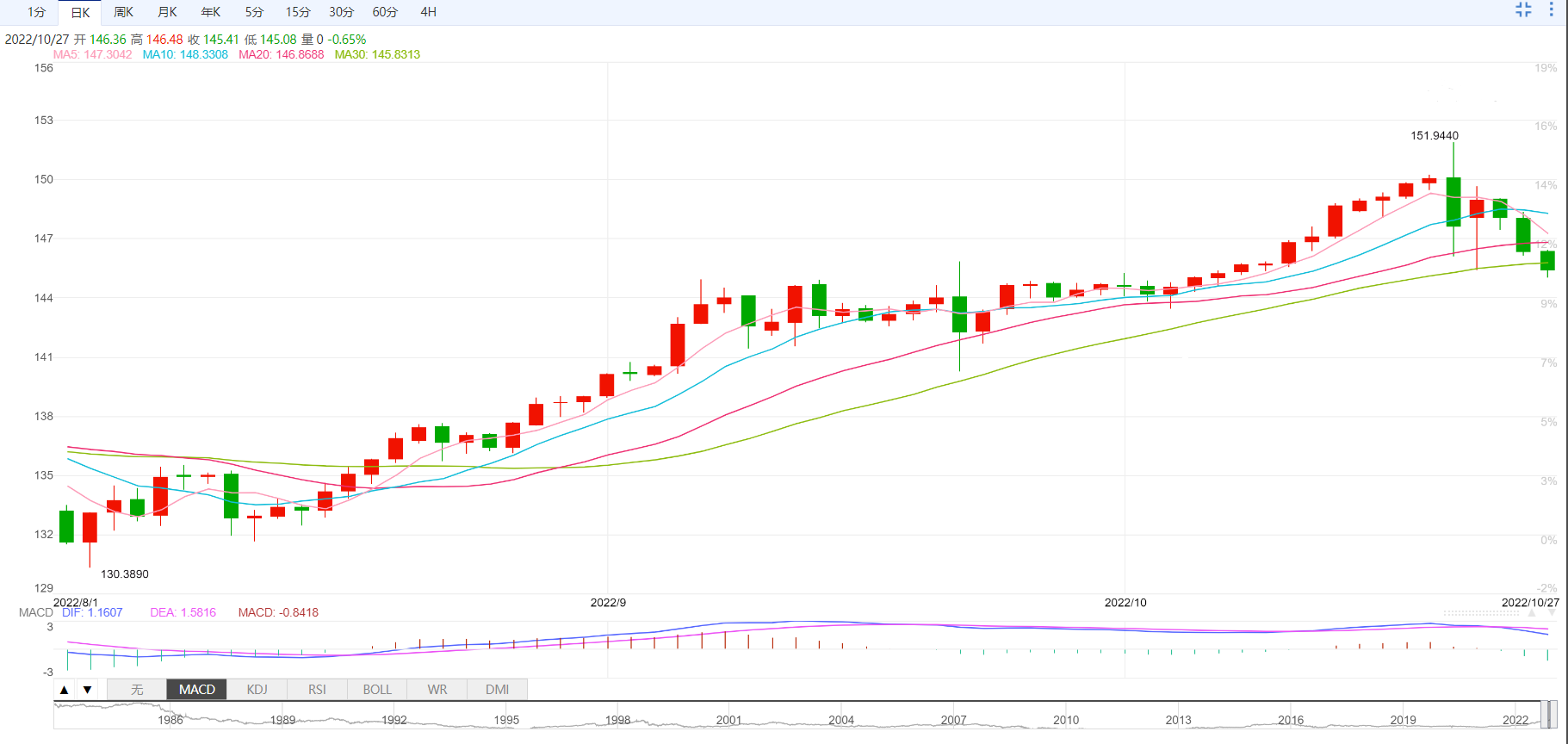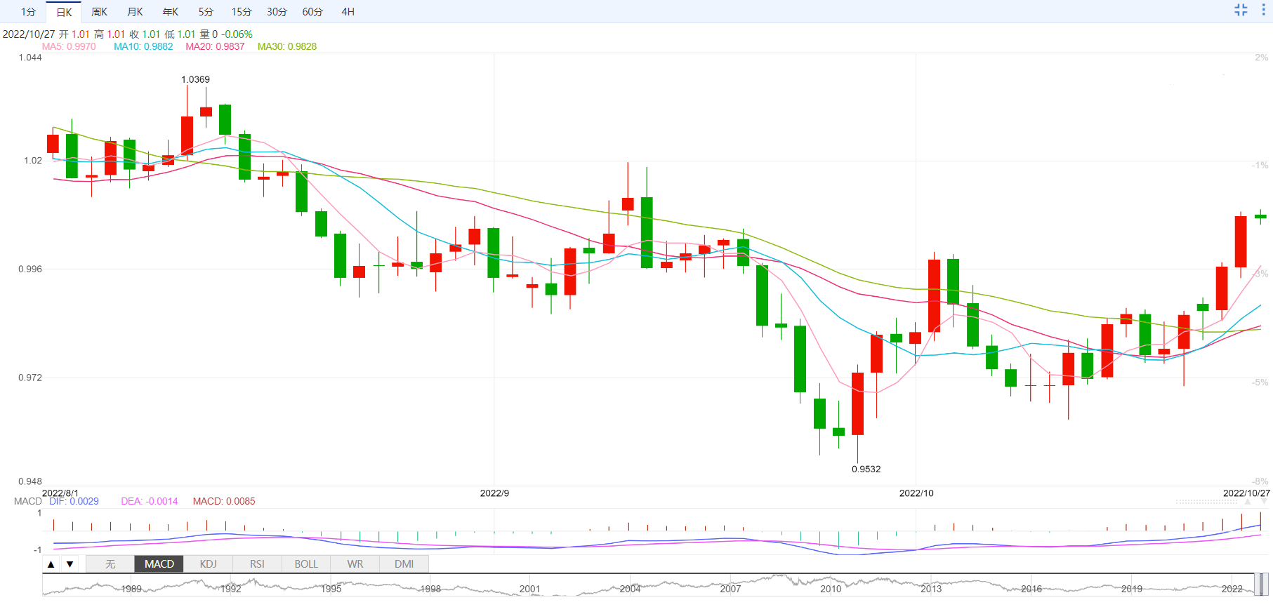 欧元兑美元当日几乎持平于1.0075附近。投资者暂停并避免对该货币对下任何方向性押注,等待关键的欧洲央行加息决议和最新的美国第三季度GDP数据。对欧洲央行超大规模加息的预期支撑了近期欧元/美元的上涨,而美元指数则被抛售,因为面对世界最大经济体-美国疲软的经济数据,美联储可能转向鸽派立场。