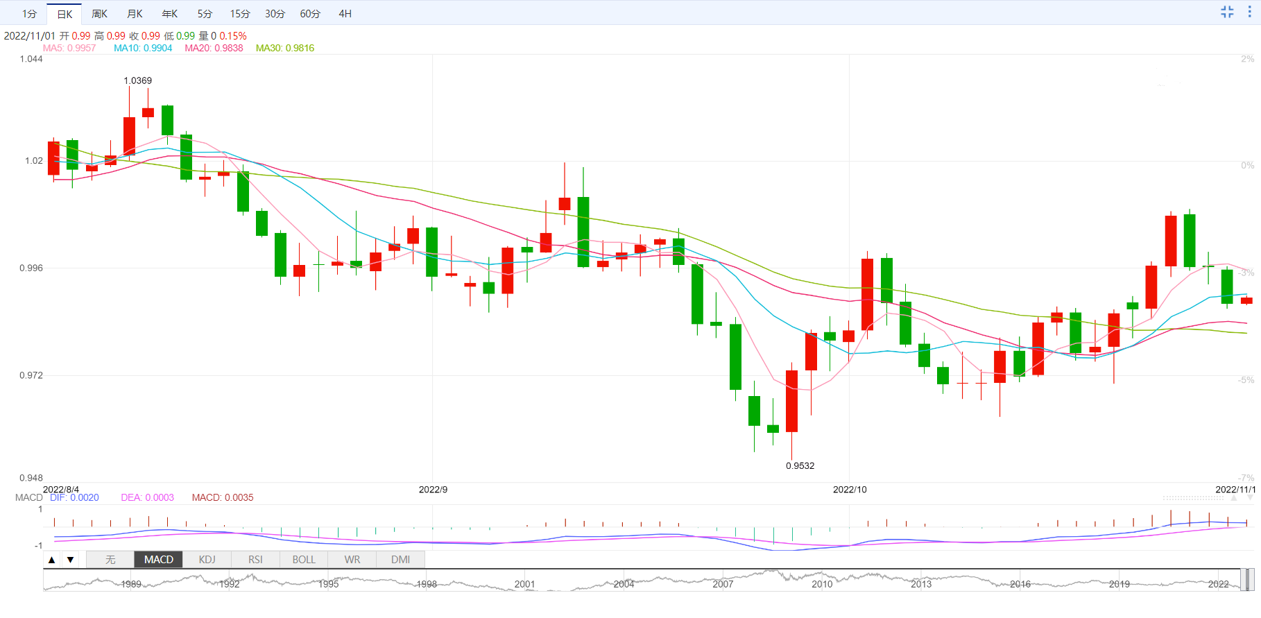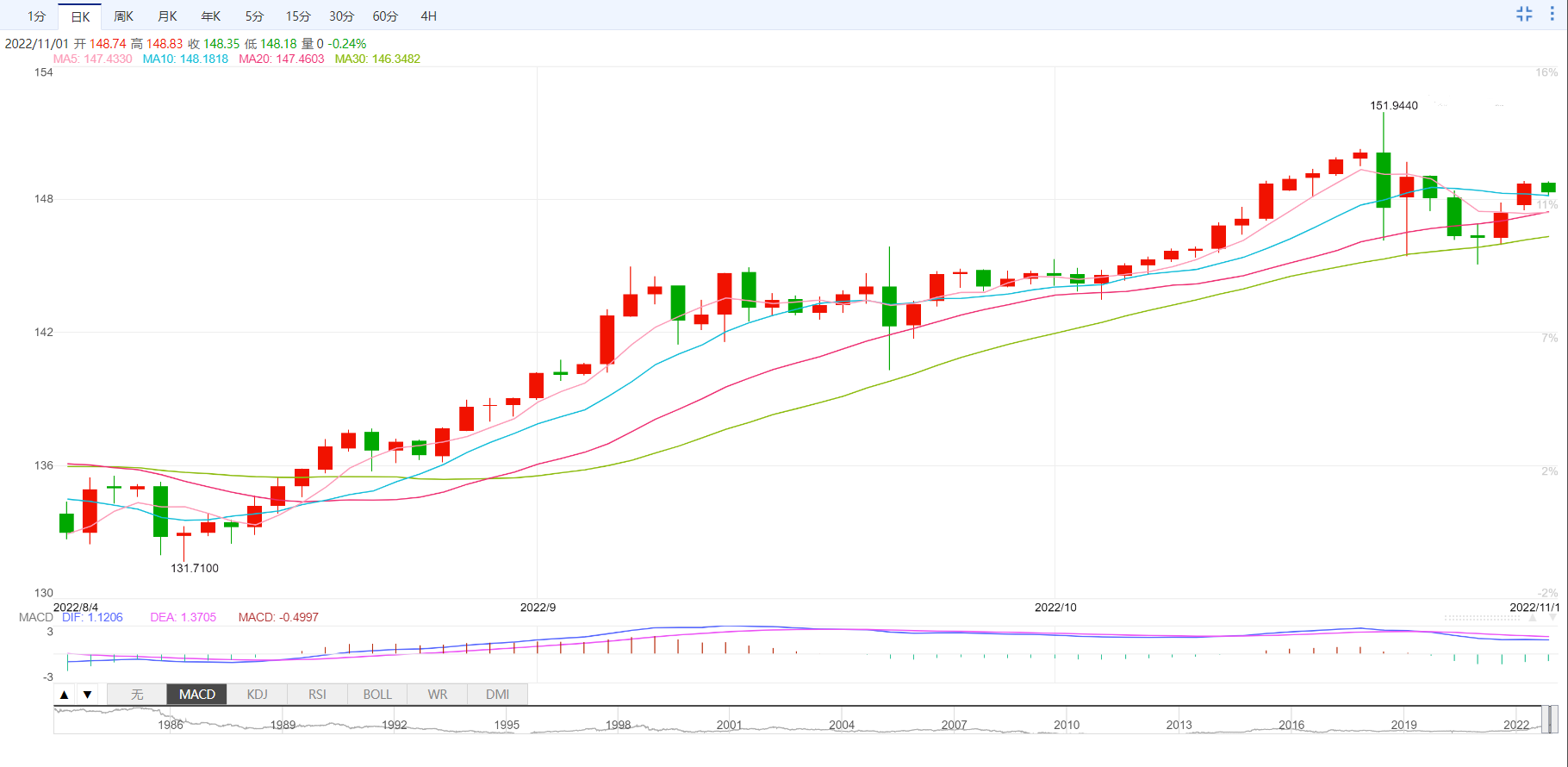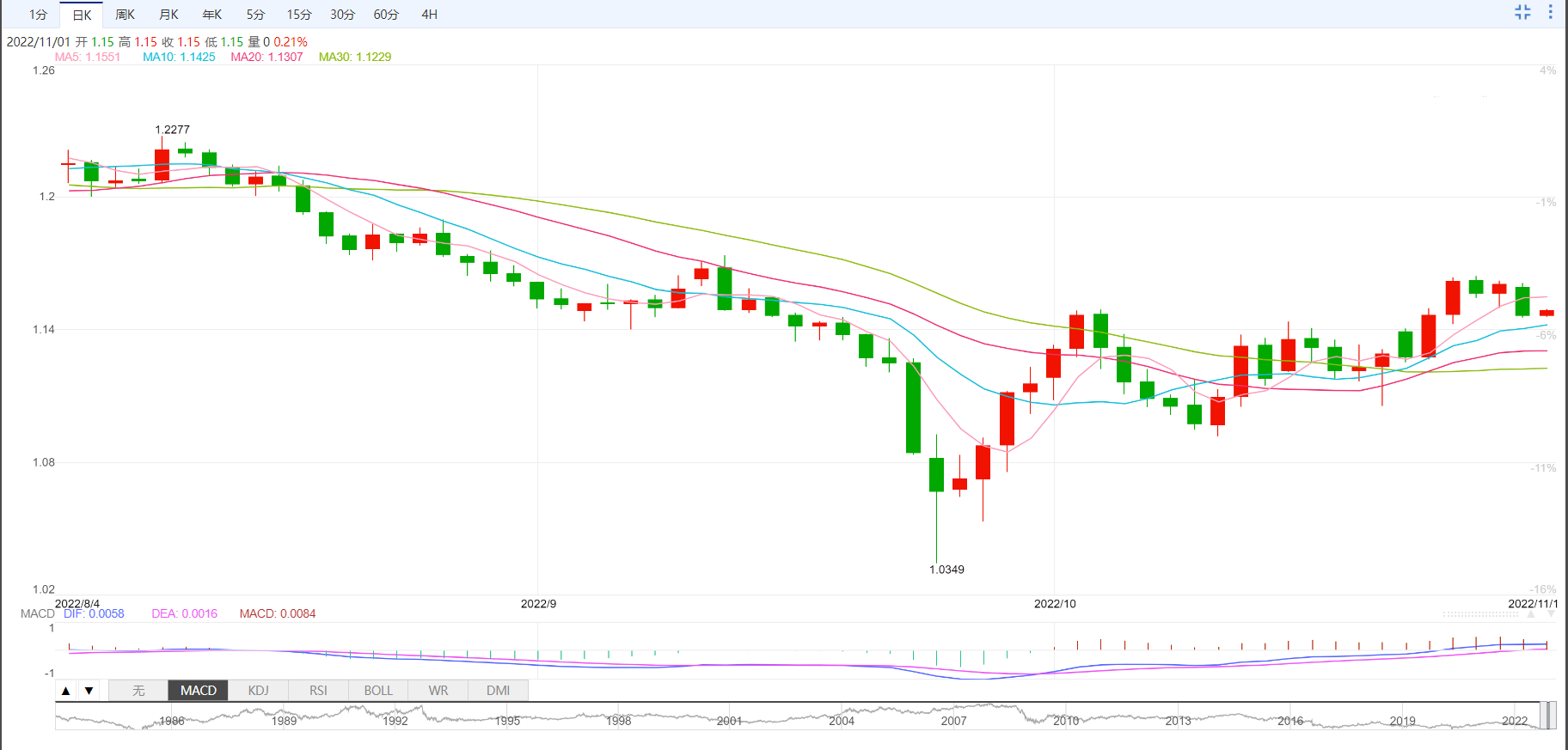 周二盘中,美元指数微跌,目前交投于111.52附近。美元周一全线上涨,收复本月稍早的部分失地,因预期本周四美联储召开货币政策会议时将再次大幅加息。美元兑日元收涨0.86%,报148.74。汇价10月份上涨2.72%,连续第三个月上涨。英镑兑美元收跌1.31%,报1.1460。英国央行可能会在周四的会议上加息75个基点,尽管分析师表示,长期利率预期正面临持续压力。