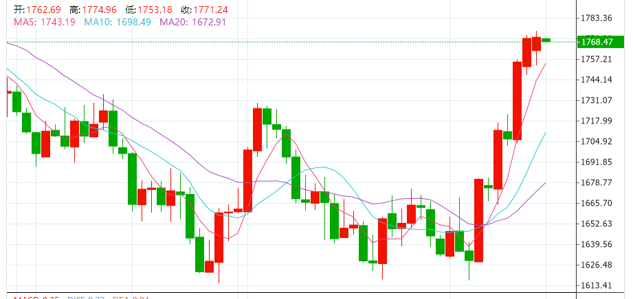 周一(11月14日),现货黄金大幅震荡,一度跌1%,日低跌至1753美元附近,后来随着美元涨幅回落,金价反弹,最终勉强收涨0.01%,报1771.49美元/盎司;现货白银盘中突破22美元/盎司,收涨1.27%,报21.98美元/盎司。