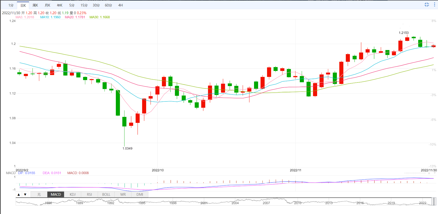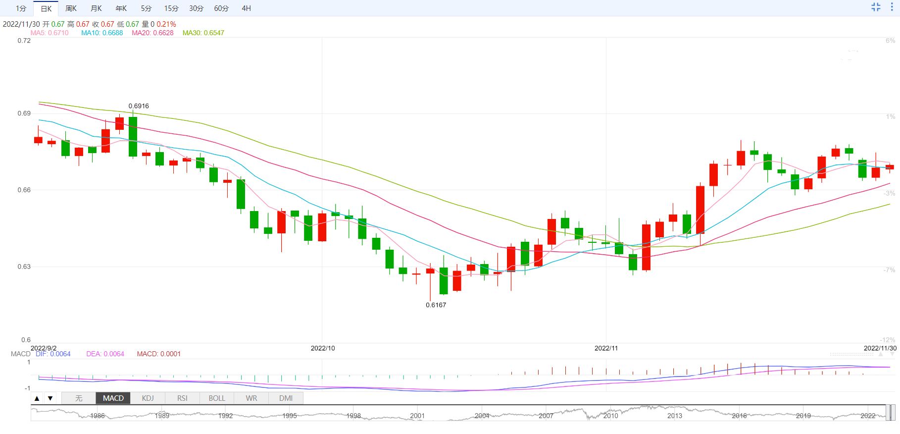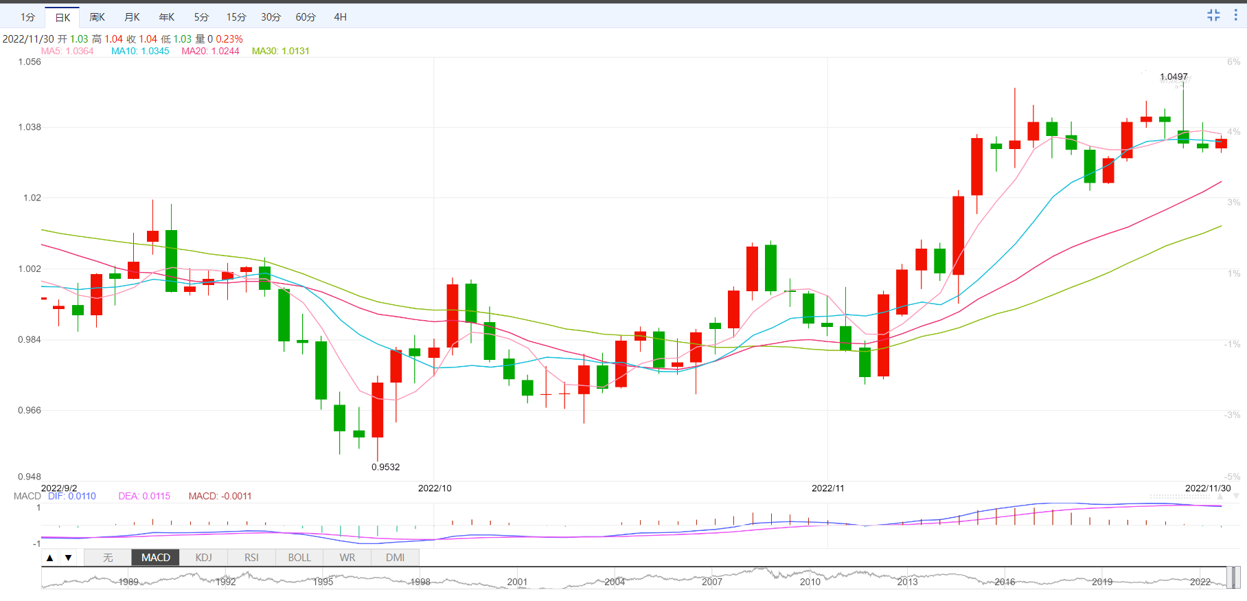 欧元/美元下跌至1.0320附近后反弹。目前该货币对成功守住1.0300的整数水平支撑,在欧元区调和通胀率公佈之前料继续盘整。欧元区方面,投资者预计该地区通胀率数据。根据市场共识,预计欧元区11月总体调和通胀率下降至10.4%,前值10.6%。而剔除原油和食品价格的核心通胀率料保持在5%不变。