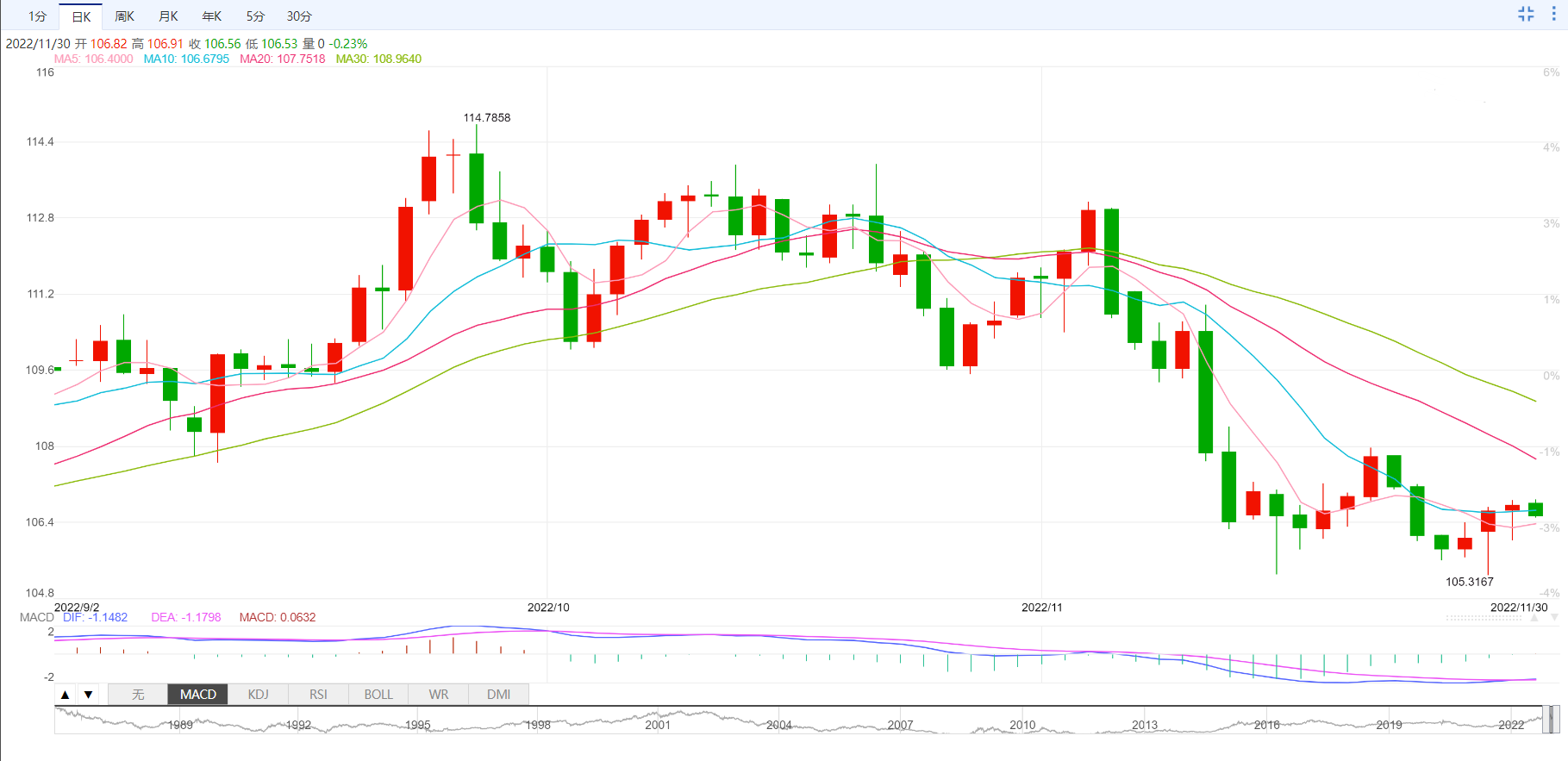 风险厌恶情绪减弱且美元整数变得震荡,由于预计美联储主席鲍威尔在周三的演讲中将对利率发出‘不太鹰派’的指引,美元指数上行似乎受限。标普500指数期货表现伐善可陈,预计鲍威尔讲话后投资者将重新投入资金至股市。美元指数预计将触及107.00的圆形阻力位。在美联储主席杰罗姆·鲍威尔发表讲话之前,风险冲动是极其谨慎的,因为预计他将提供有关大幅加息速度放缓的线索。