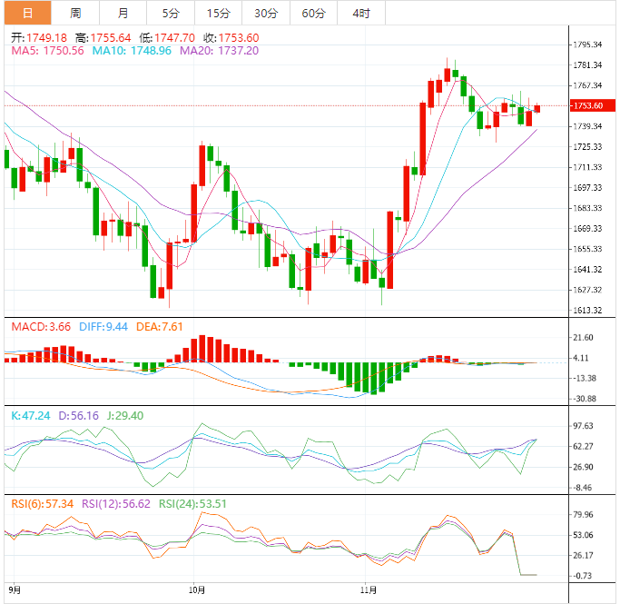 技术面:黄金价格在每小时1740-1760美元的区间内横盘表现,这是在关键经济催化剂的发布和美联储鲍威尔的讲话之前。位于1,751.00美元的20期指数移动平均线(EMA)与该资产重叠,这表明未来将出现盘整。