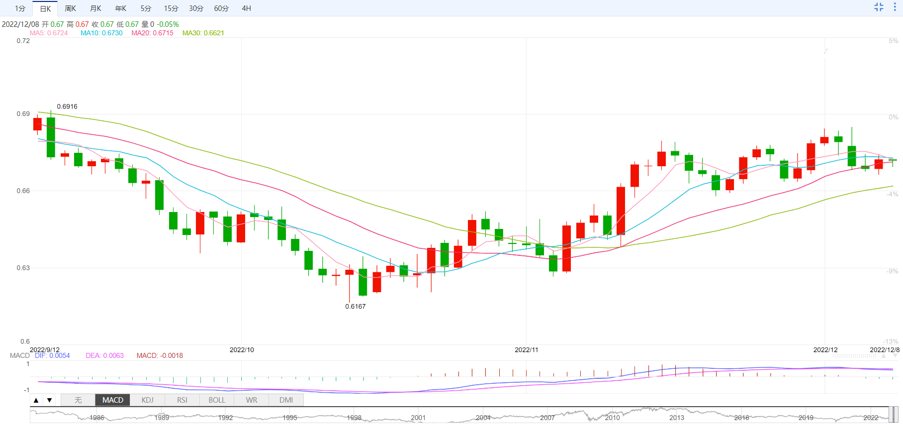 美元指数试图突破105.20的直接障碍时遇到了障碍。由于市场参与者的风险偏好显著改善,美元的上行似乎受到了限制。美国联邦储备委员会(Fed)在12月货币政策会议上提出上调利率峰值指引的不确定性,令投资者不以为然,纷纷将资金投向风险敏感资产。美元开始面临来自市场参与者的压力,因为投资者认为,联邦公开市场委员会(FOMC)在达到中性利率后,将从明年开始暂停紧缩政策。