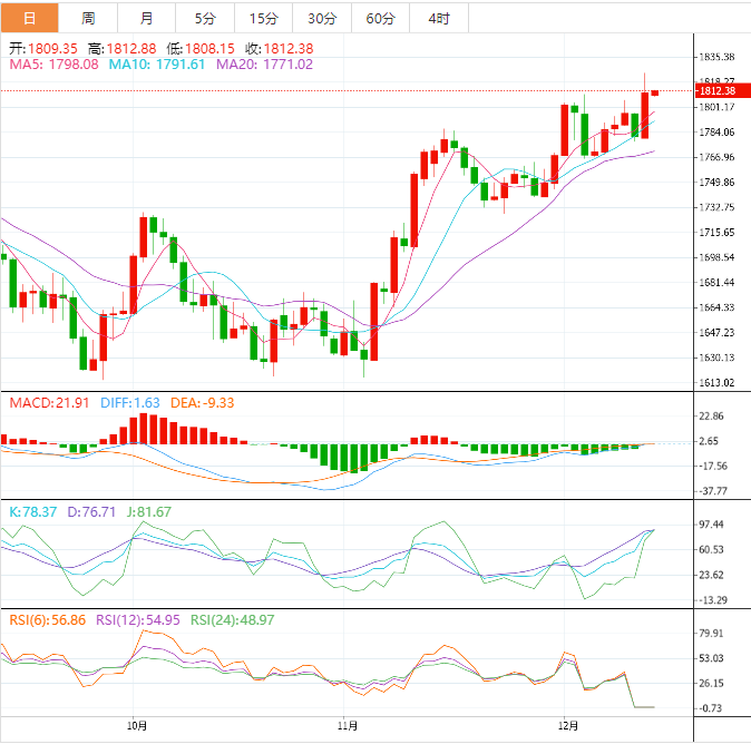 技术面:黄金价格在一周前的阻力线和11月15日的阻力线上升趋势线之间徘徊,分别接近1,805美元和1,820美元,因交易商等待美联储的决定。金价也从接近超买的RSI和看涨的MACD信号中获得线索。然而,值得注意的是,金条的成功交易超过了100-SMA水平,约为1772美元,这让黄金买家充满希望。