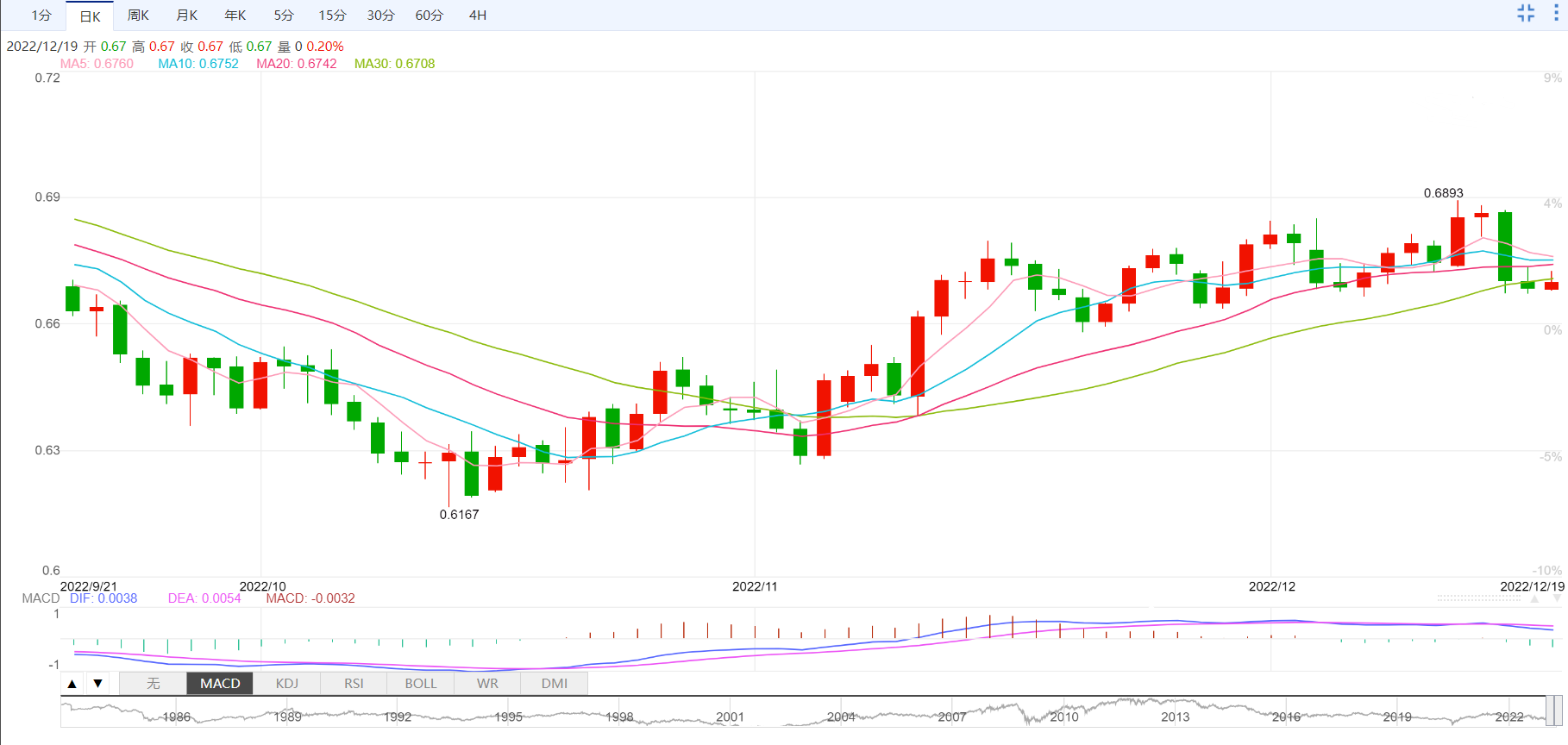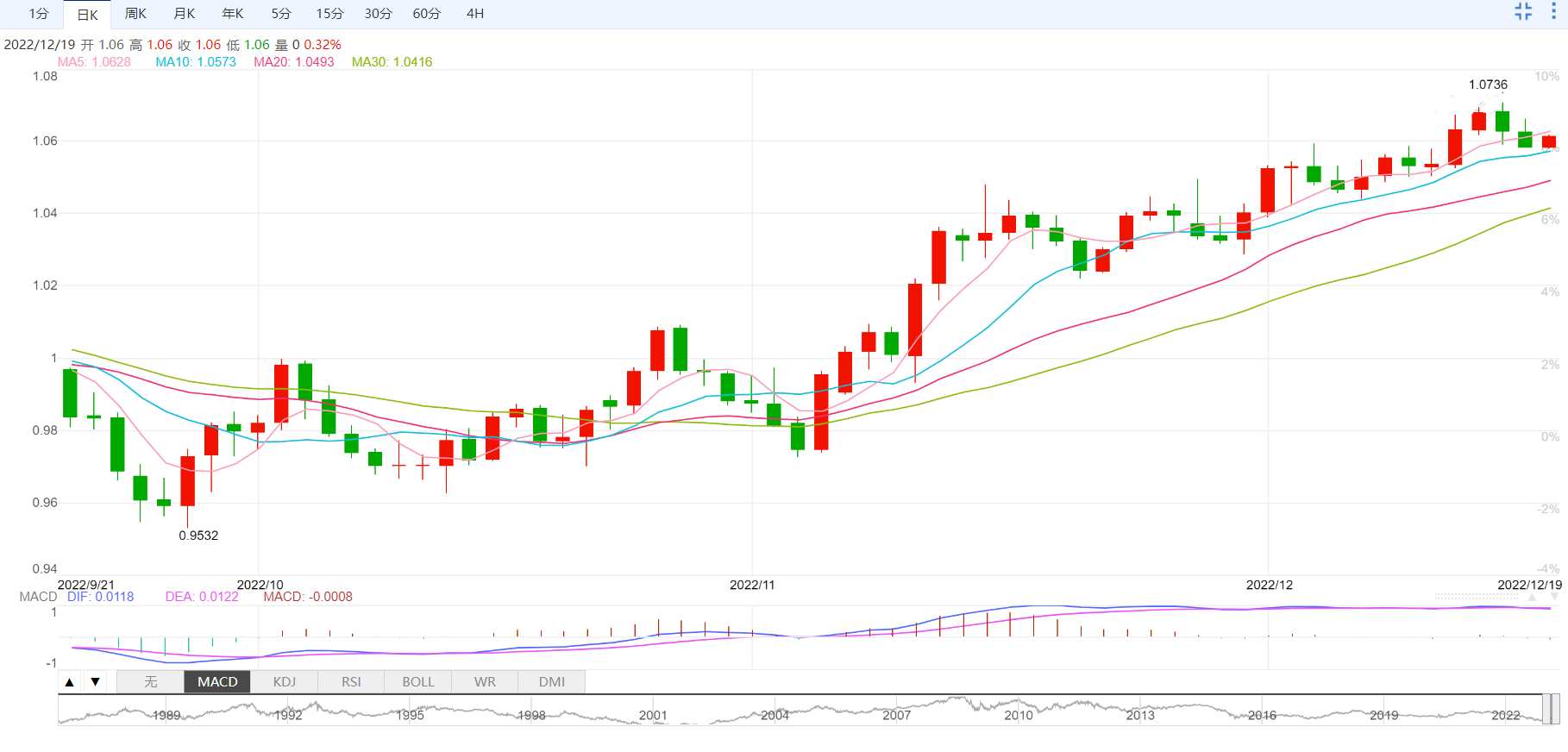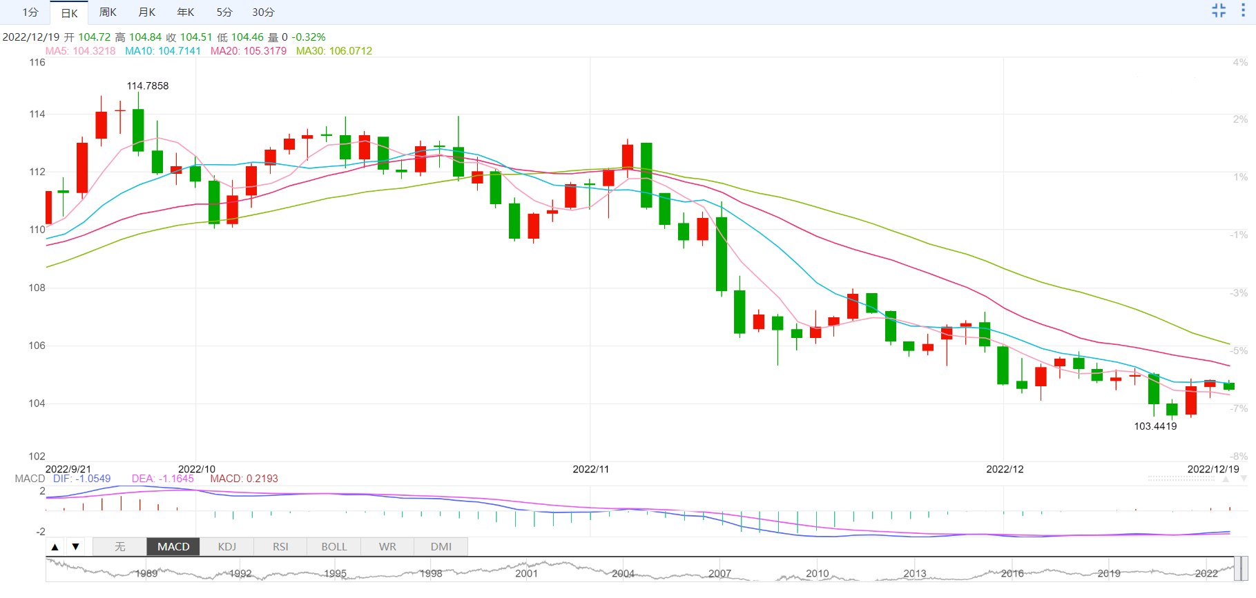 美元指数录得三日内首日下跌,盘中下跌0.20%至10.455附近。在此过程中,DXY难以证明克利夫兰联邦储备银行行长Loretta Mester和纽约联邦储备银行行长John Williams最近的鹰派言论是正确的。其原因可能与週五美国12月PMI初值的不乐观数据,以及美联储0.50%的加息有关。