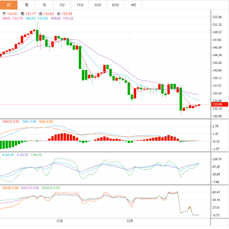 周二亚洲时段,美元指数窄幅震荡,目前交投于104.13附近;上一交易日因为圣诞节补休,汇市整体交投清淡,日本央行行长否认短期内推出宽松政策的可能性,日元涨势放缓,美元兑日元周一收涨0.08%,收报132.87附近。