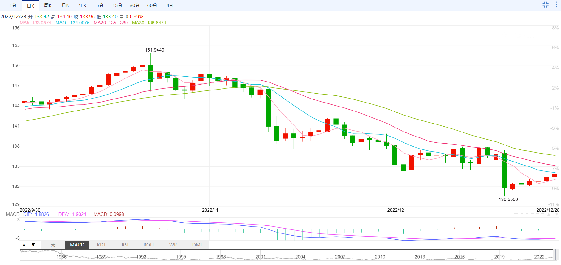 美元/日元震荡于134.00附近,多头占主导,美元/日元处在五日上涨趋势当中,处在周线高位附近。在这期间市场交投低迷,美元/日元触及50-SMA水平。由于美元/日元自上週走出的四个月低点稳步反弹,短线获得支撑且MACD信号看涨,美元/日元可能会突破当前阻力,即50移动均线水平134.00。即便如此,12月15日以来的下降倾向阻力位(截至发稿时处在134.45)将成为美元/日元目标,然后是月初低点以来的前期支撑(接近135.50),将成为美元/日元短线阻力。