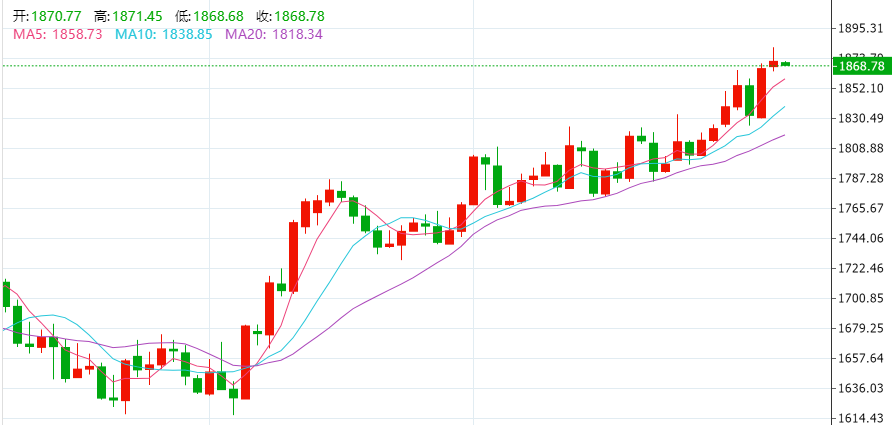 周一,现货黄金高位震荡,并一度上破1880美元大关,最终收涨0.32%,报1871.62美元/盎司;现货白银于欧盘回吐日内所有涨幅并转跌,最终收跌1.47%,报23.66美元/盎司。另外,MSCI新兴市场指数步入技术性牛市。