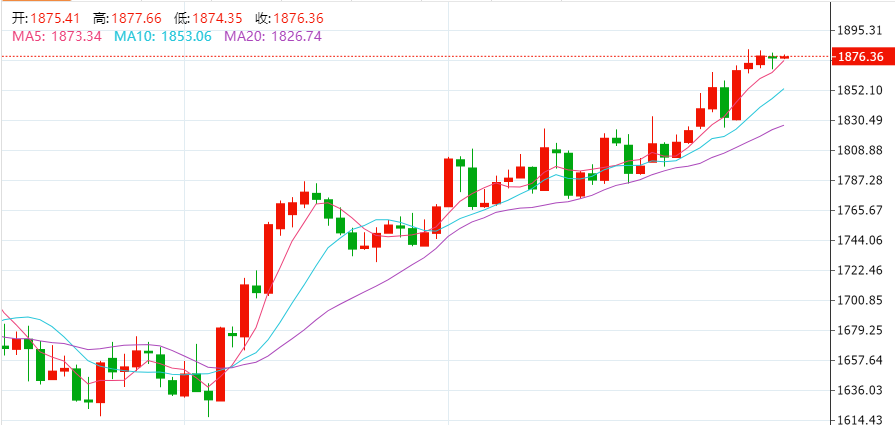 周三,现货黄金于亚盘开启涨势,一度至1886.53美元的日内高点,但在美盘时段回吐所有涨幅并转跌,最终收涨0.07%,报1875.46美元/盎司;现货白银日内一度站上24美元大关,而后随黄金回落并转跌,最终收跌0.78%,报23.75美元/盎司。铜价自去年6月以来首次突破9000美元/吨。