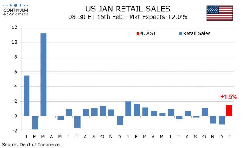 周三,从 1 月零售销售开始,数据日历量很大,我们预计 12 月零售销售将从受天气影响的 12 月反弹 1.5%,除汽车外增长 0.8%。2月份的帝国国家制造业调查将同时进行。随后是 1 月份的工业预测,我们还预计 12 月份的疲软将反弹 0.5%,其中制造业增长 1.1%。后来的现有数据显示,12月企业库存增长0.3%。2月份的NAHB房屋建筑商调查也将到期。