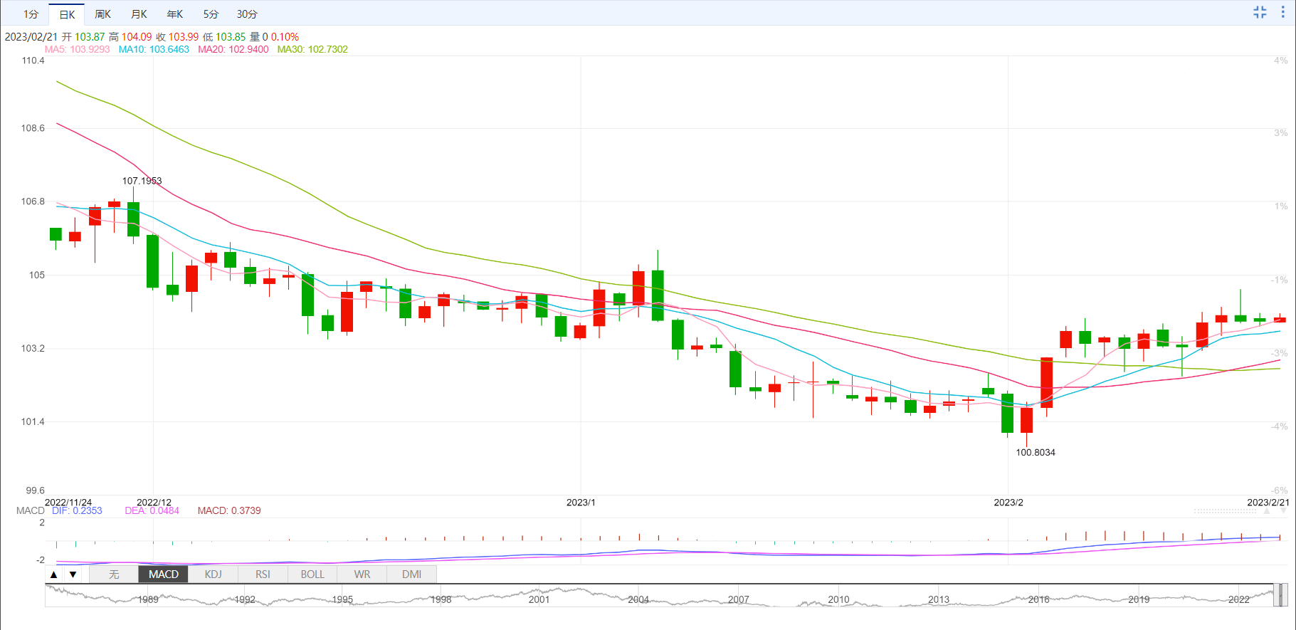 美元指数在104.00下方窄幅震荡,目前的价格走势有利于上涨趋势的持续。现在,预计在不久的将来,进一步的强势将使投资者重新关注对2023年顶部105.63(1月6日)的潜在测试。从长期来看,只要位于200日移动均线106.44下方,该指数的前景仍为负面。