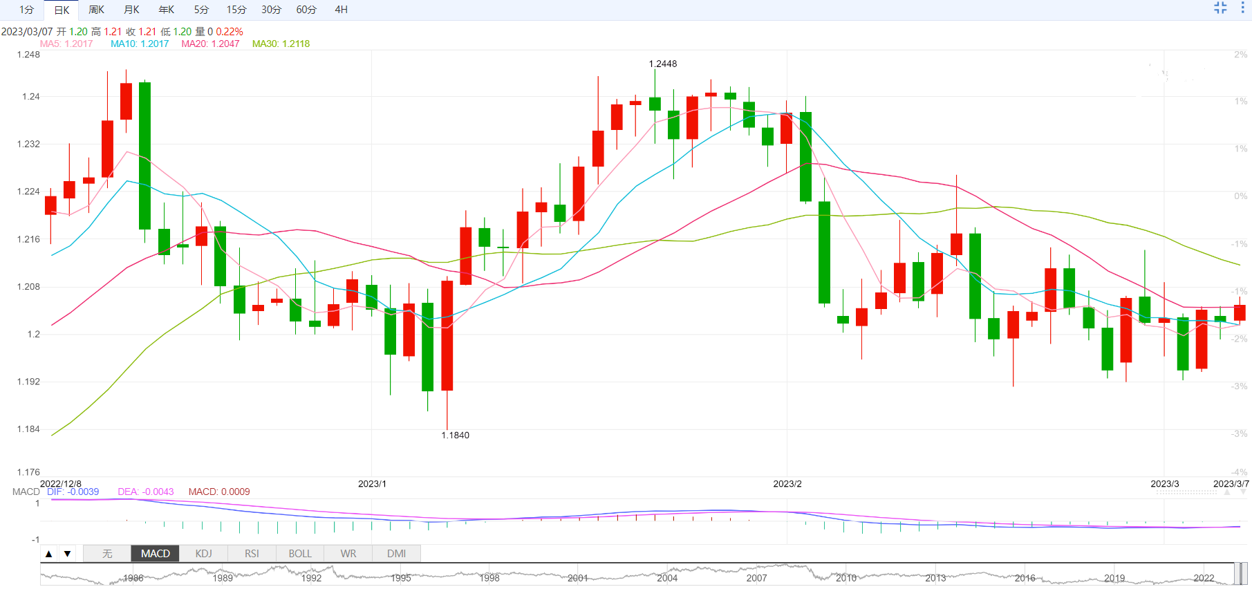 英镑/美元开盘高于日线趋势阻力线,此线从2月2日高点1.2400引出,我们将1.1926的多头止损位提高到1.1940,略低于3月3日低点,如果突破1.2100,将再次提高止损位。