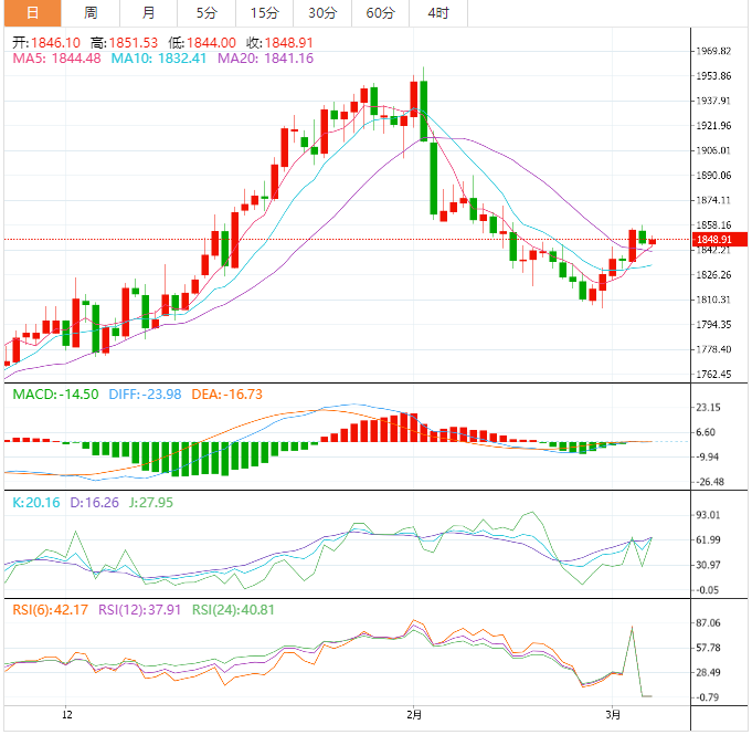 技术面:黄金价格仍处于观望状态,买家认为21日和50日指数移动均线(EMA)将在1,848美元附近会合。然而,看涨的MACD信号以及金价从200日均线持续反弹,令买家对突破前一天的顶部1,858美元抱有希望。