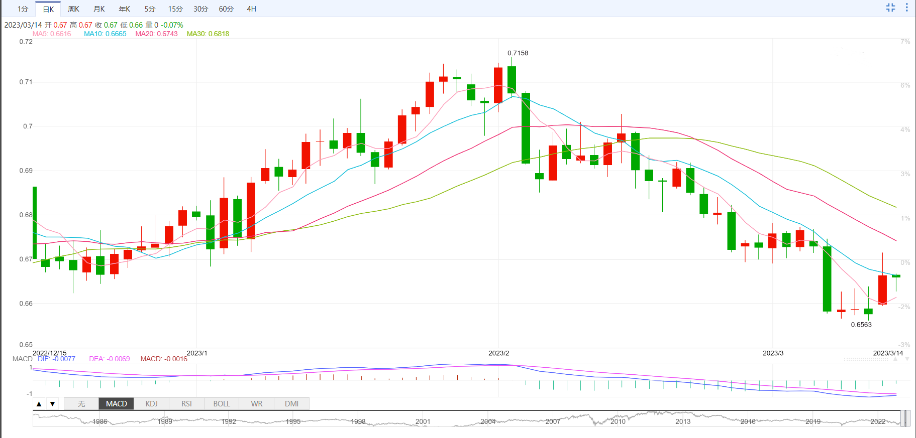 澳元/美元自四个月低点0.6564反弹后触及下降趋势线顶部。由于美元下跌,该货币对在周一大幅反弹。美联储加息50个基点的押注下降推动澳元兑美元飙高,不过硅谷银行倒闭引发的风险厌恶环境令该货币对保持下跌倾向。澳元兑美元的任何上行势头可能依然受阻于週一高点0.6713关口附近,这是支撑转阻力位,和日线图自2月以来的下降趋势线重合。