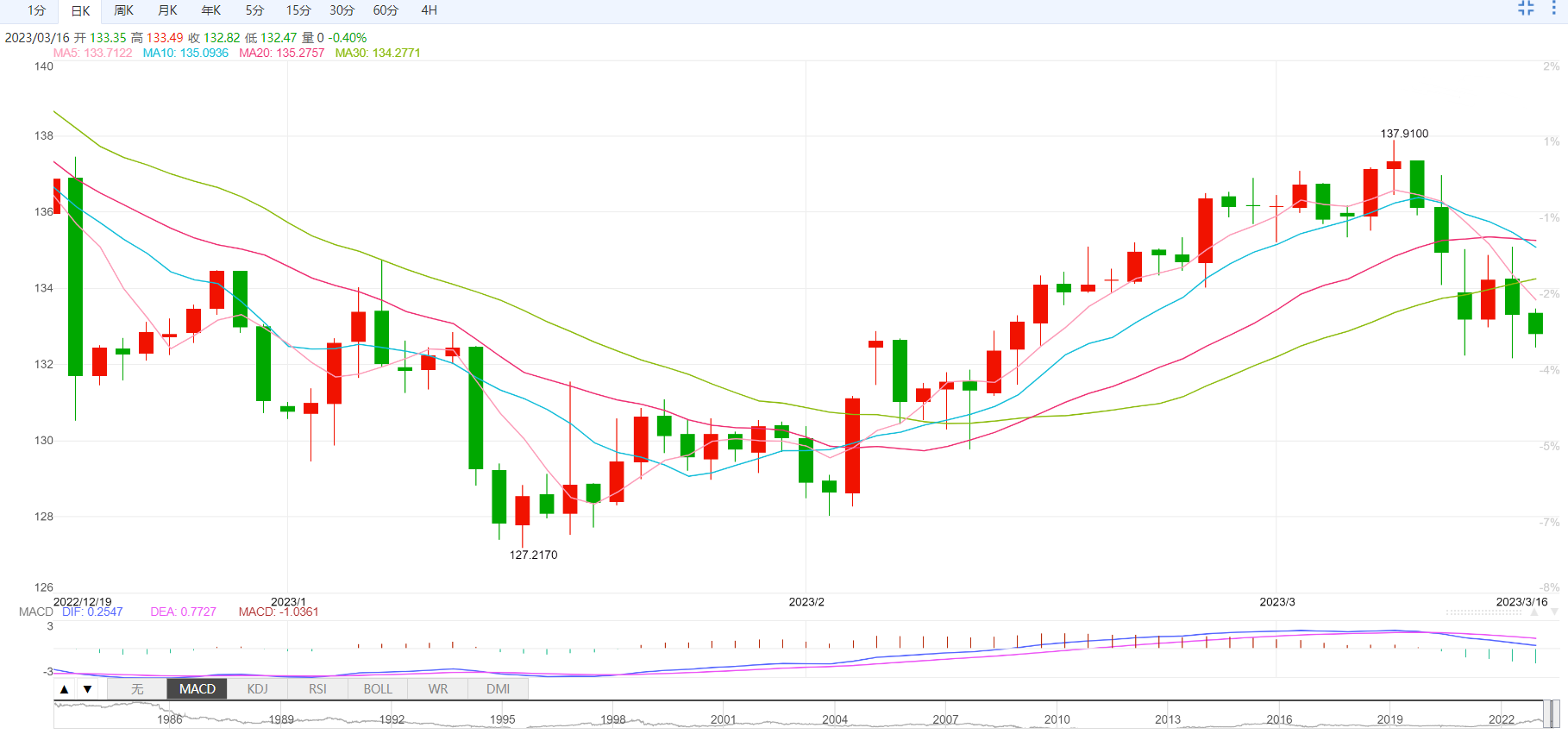 美元/日元盘整于21- 50日均线所构成的区间。美元/日元在132.35附近获得支撑位,这是一个阻力位反转成为支撑位。132.00以来的支撑区被认为是一个重要水平,该水平处在 50日移动均线和日线低位127.21以来趋势的50%斐波位汇合处附近。相对强弱指标走出更低的低点表明美元/日元还存在进一步下行空间。继瑞士信贷银行出现风险后,美债收益率正削弱美联储加息预期。无论从技术面还是基本面来看,美元/日元都维持稳定的下跌倾向。