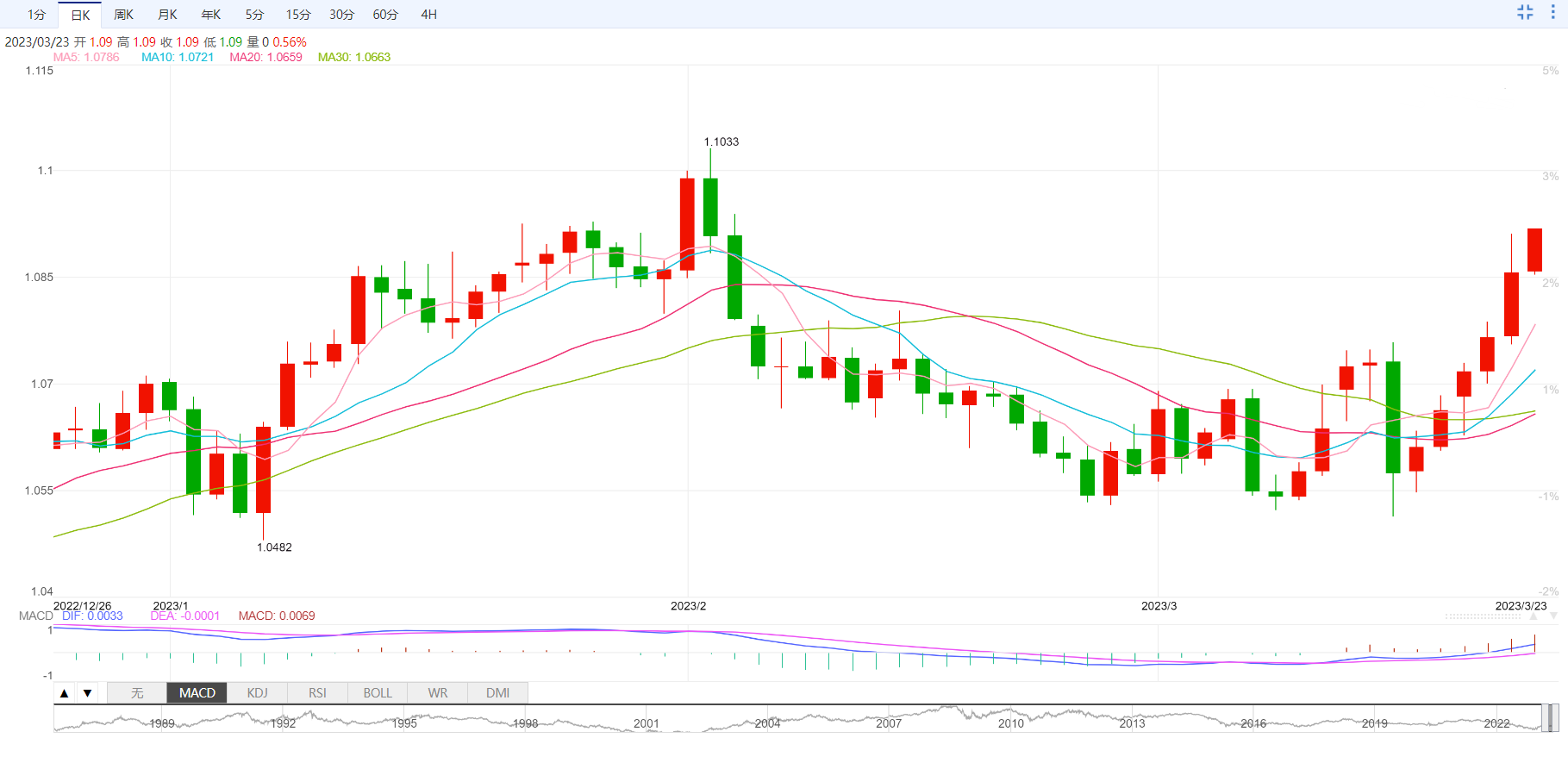 欧元兑美元在一轮阻力位1.0900附近徘徊,由于美国联邦储备委员会(Fed)已经释放出暂停收紧政策进程的迹象,这对主要货币对有望超越这一水平。欧元兑美元已经信心十足地突破了61.8%的斐波那契回撤位(从2月1日的高点1.1033到3月15日的低点1.0516)1.0834。向上倾斜的10期和20期指数移动平均线(EMAs)分别位于1.0854和1.0819,这表明上行势头非常稳固。