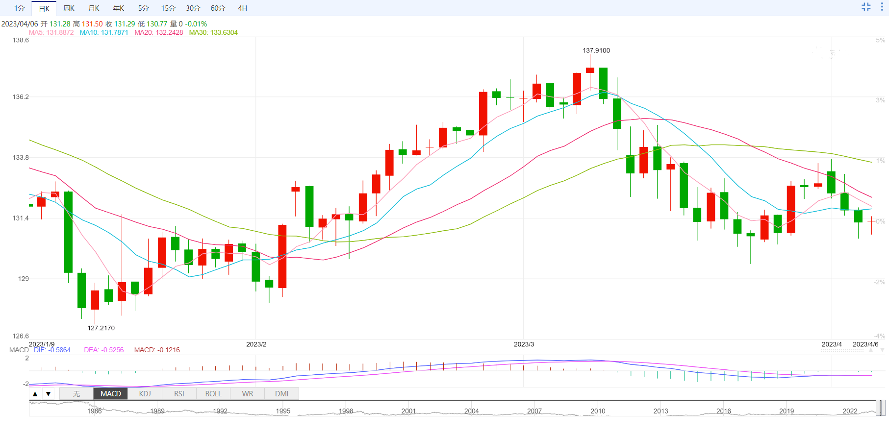 由于美元守住前日自两个月低点的反弹行情,美元兑日元在131.20附近整理盘中跌势。即便如此,该货币对仍将逆转上週涨势,为五週以来首周首周,因为国债收益率下跌。日本央行被美联储之间可能的货币政策背离似乎打压该货币对。在行长任期内日本央行退出宽鬆货币政策的讨论提振日元,尤其是当需要扭转黑田东彦在过去10年领导期间推出的1.55万亿日元(11.7万亿美元)的刺激措施时。