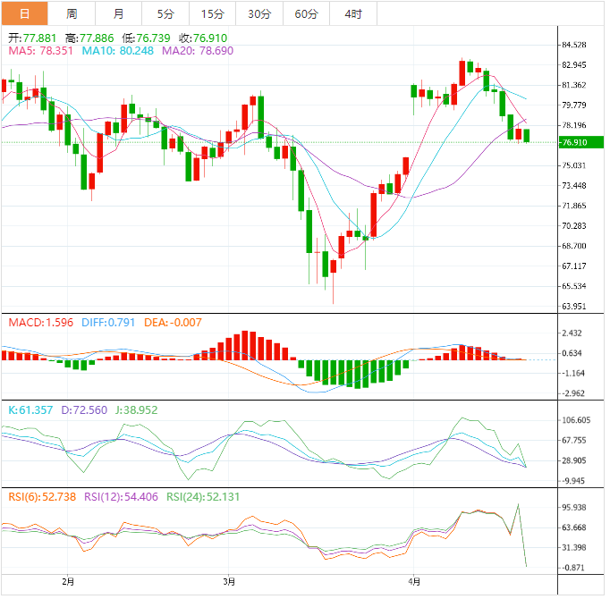 技术面:相对强弱指数(RSI)(14)预计将回落至20.00-40.00的看跌区间内。油价在跌破4月3日低点79.00美元的关键支撑位后急剧下跌,这已成为多头的阻力位。原油下行走势预计将放弃OPEC+意外宣布减产后的全部涨幅。