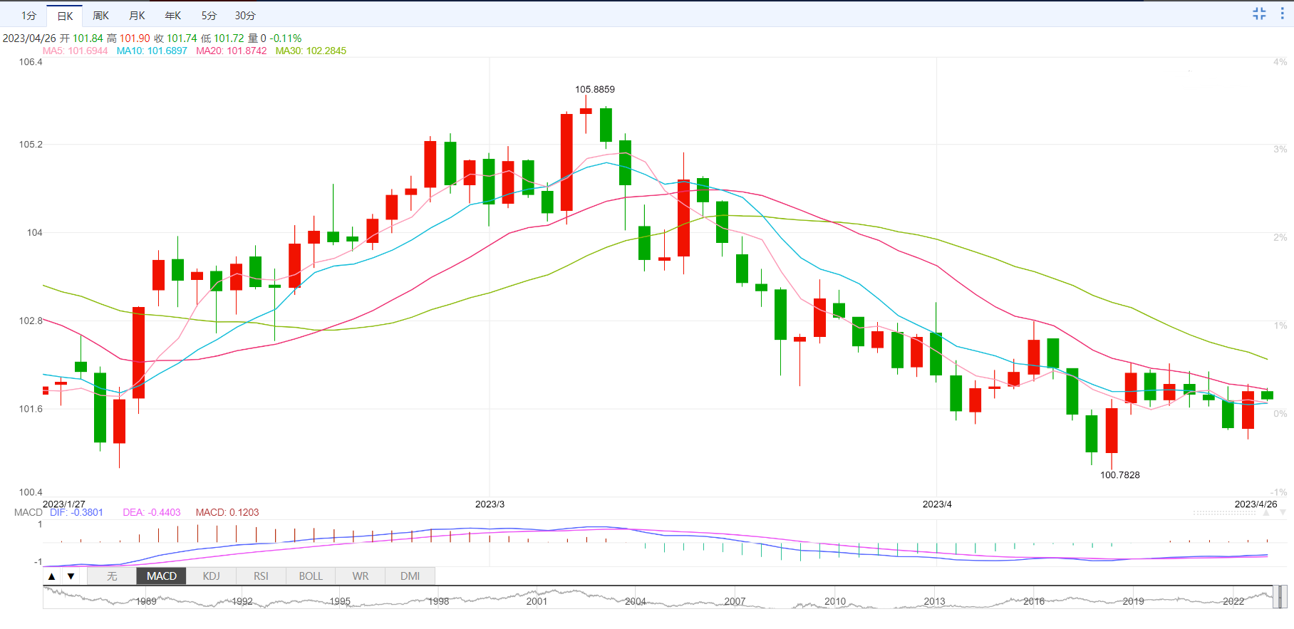 技术面:目前美元指数下跌0.09%报101.75,突破100.78(2023年4月14日低点)将打开跌向100(心理水平)和99.81(2022年4月21日低点)的大门。另一方面,下一个阻力位于102.80(4月10日高点),然后为103.05(4月3日高点)和103.21(55日SMA)。