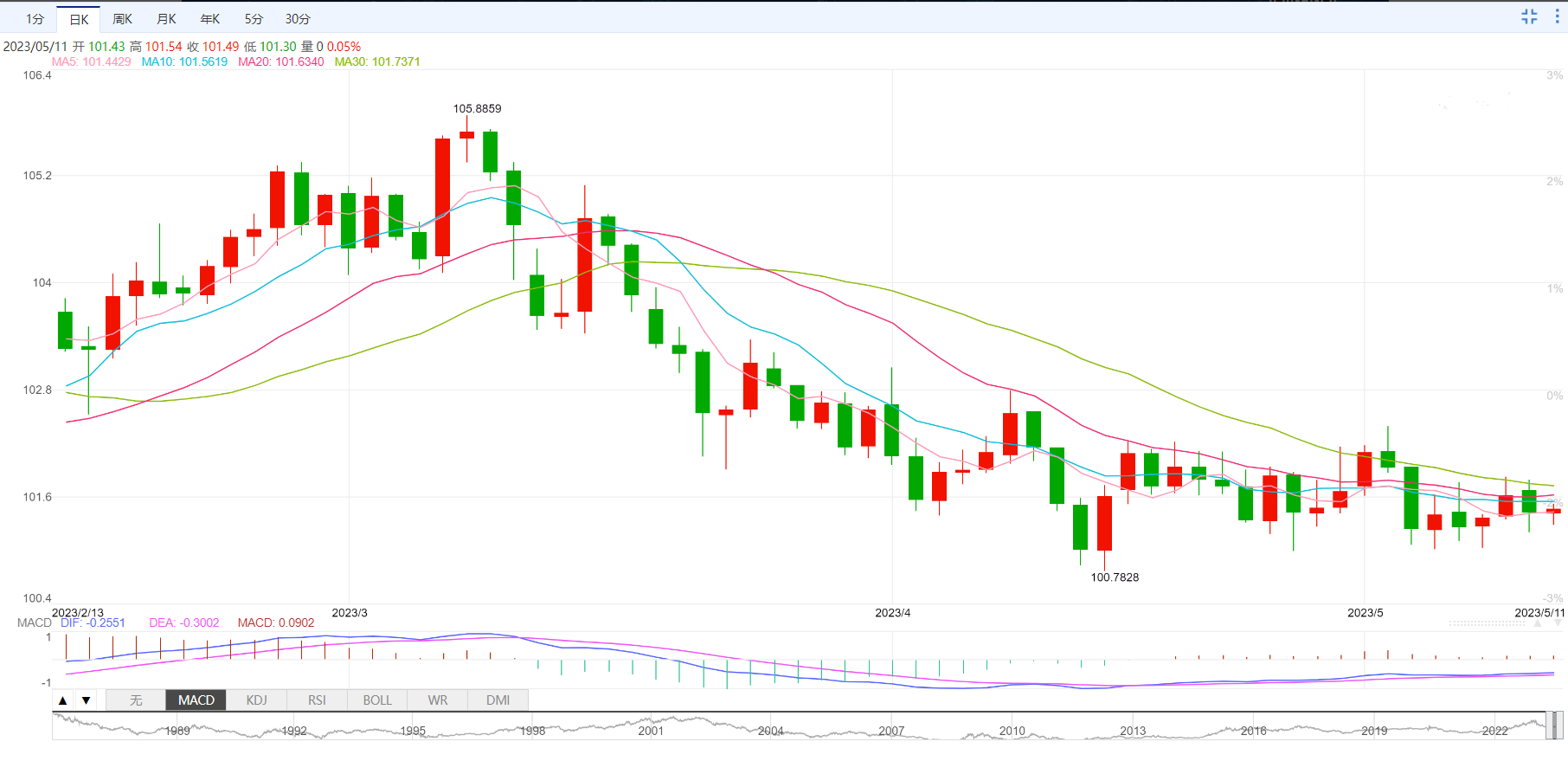 美元指数:截止发稿,美元指数上涨,现报101.64,涨幅0.20%。欧市盘前,美元指数在该区间的下端保持了一周的盘整情绪,目前在101.00附近有坚实的支撑。目前美元的价格走势继续与美联储紧缩周期最快将在6月14日会议上陷入僵局的预期相符。芝加哥商品交易所集团(CME Group)的美联储观察工具(FedWatch Tool)认为,这种情况发生的可能性接近94%。美国4月通胀率年率回落至4.9%,市场预期为5.0%,为两年内首次跌破5%。不过核心CPI依然良莠不齐,加剧了对美联储在2023年出现政策转向传闻的质疑。
