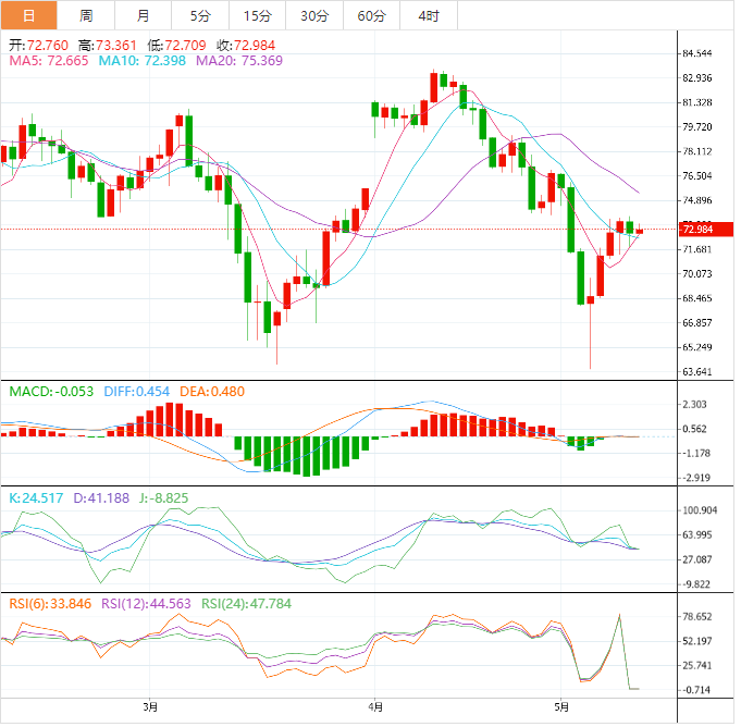 技术面:WTI原油日收水准未能突破一个月来的阻力位(截至发稿时约为72.80美元),令能源卖家有希望看到价格回调至近72.30美元的10日移动均线支撑位。