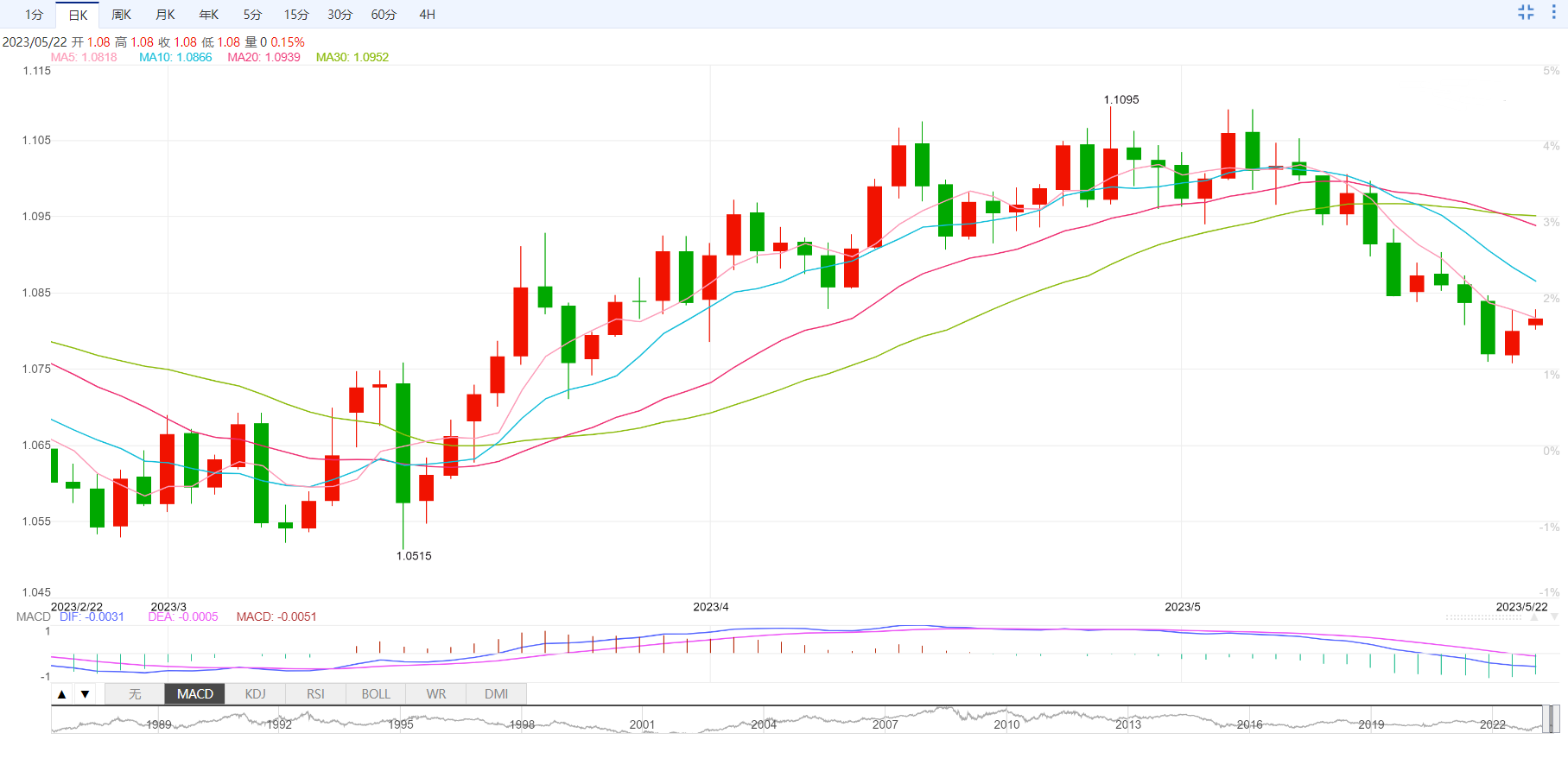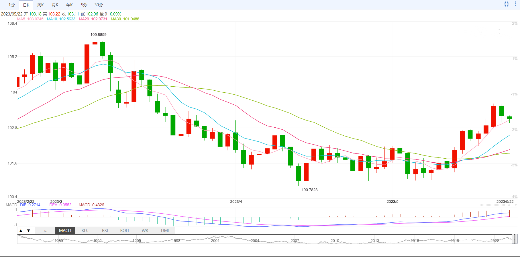 美元指数目前下跌0.13%,交投于103.05附近。