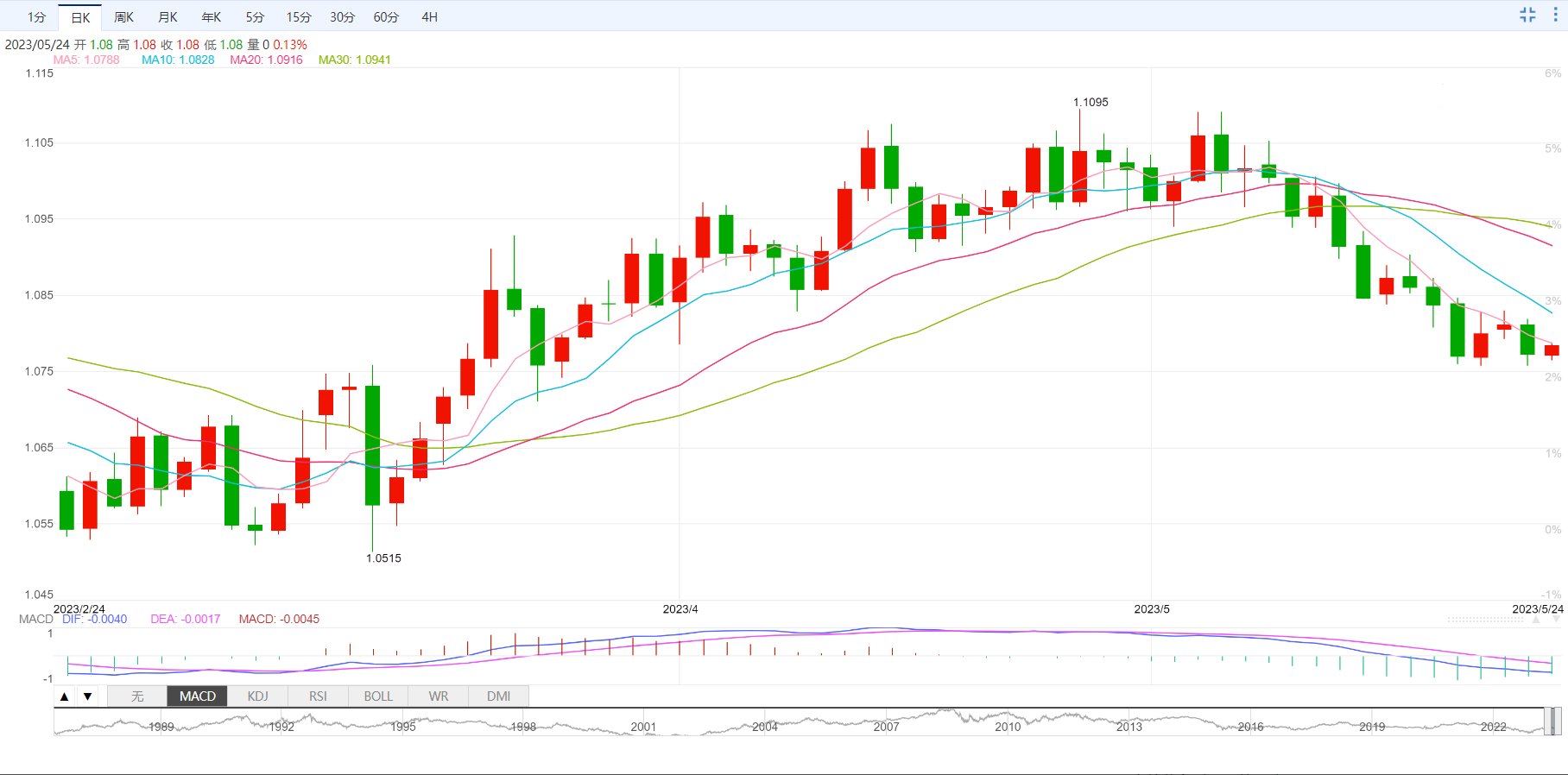 技术面:目前美元整数下跌0.12%报103.39,下一个支撑位于55日SMA均线102.45,然后为101.01(4月26日低点)和100.78(2023年4月14日低点)。上涨方面,若突破103.65(5月23日高点)将打开升向105.73(200日SMA均线)和105.88(2023年3月8日高点)的大门。