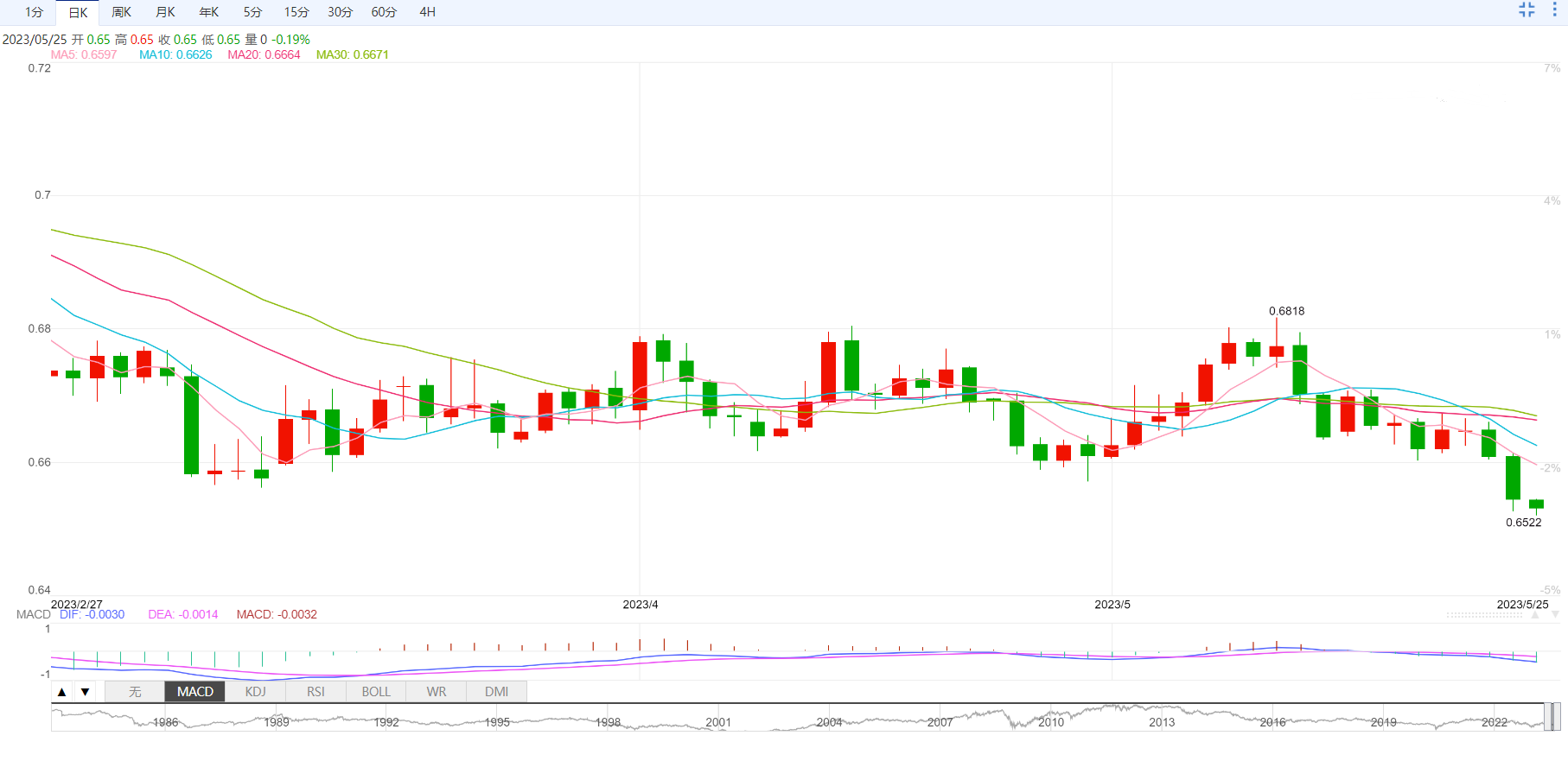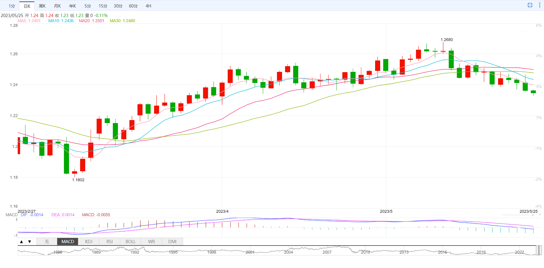英镑/美元刷新六周低点1.2332后略现反弹。美国债务上限问题悬而未决,投资者维持风险厌恶情绪,预计英镑弱势回调后将恢复下行之旅。英镑方面,週三公佈的英国通胀数据仍然好坏参半,因为整体消费者物价指数(CPI)下降,但仍远高于预期,而核心通胀进一步上升。这可能会迫使英国央行(BoE)提前宣布推出更多利率政策。