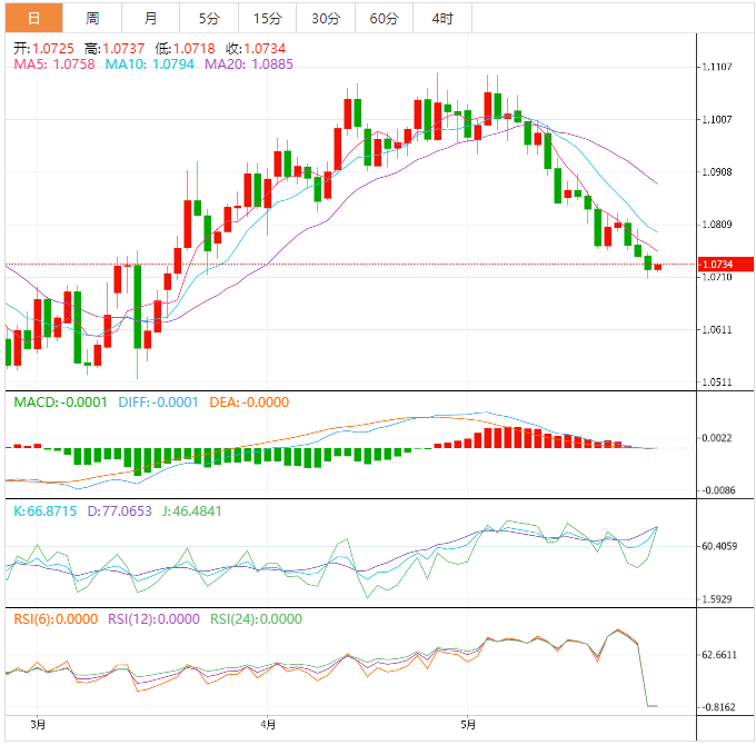 周四欧元兑美元继续下跌,一度跌至1.0706,为近两个月新低,最后收跌0.24%,报1.0724。欧元区几个主要国家的经济增长乏力,令欧元承压。德国经济衰退将动摇许多押注欧元升值人士的信念。德国经济继第四季萎缩后,第一季亦意外萎缩,第一季GDP较前季下降0.3%,预估为持平;较上年同期下跌0.2%,预估为成长0.2%,经济经季节调整后同比下滑0.5%,前值为下滑0.1%。