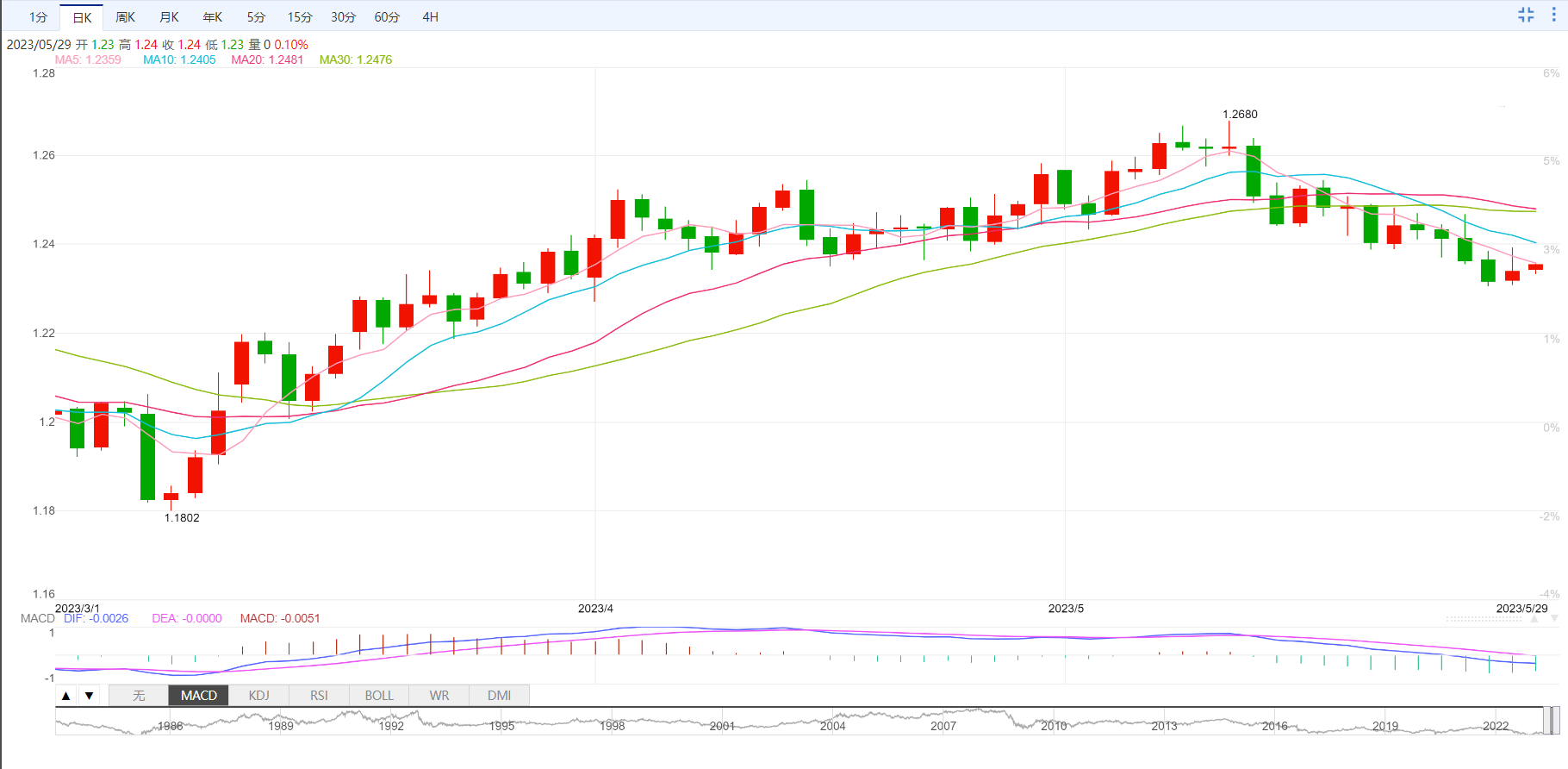 英镑/美元横盘于1.2350下方后,试图反弹。美国债务上限临时协议获批后美元指数抛售,美元指数出现了明显的下跌,这导致英镑/美元强劲。以凯文-麦卡锡为首的众议院共和党人已经批准两年内上调31.4万亿美元的美国债务上限,因为白宫同意削减预算开支,但仍然顽固地认为既不能削减医疗保险,也不能增加贫困。
