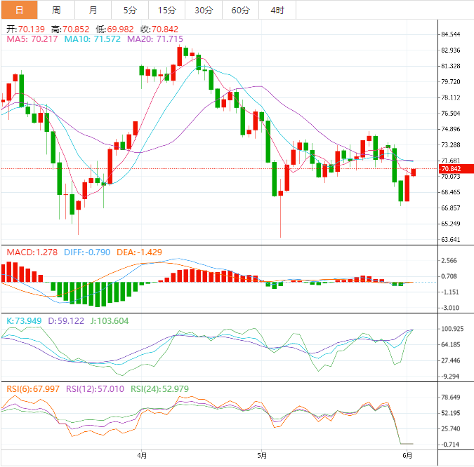 技术面:WTI油价突破72.50美元并不在公开邀请WTI多头,因为5月下旬震荡区间高点74.70美元是多头最后防线。下行方面,若WTI油价明确跌破21指数移动均线发稿时处在70.00美元附近整数关,可能会吸引空头。