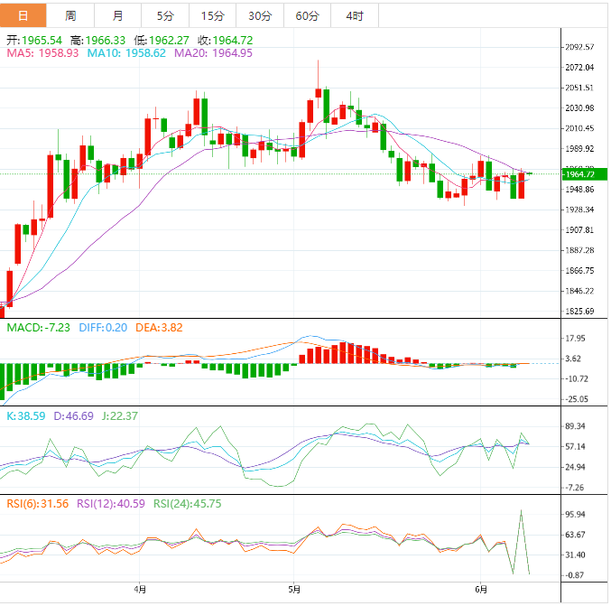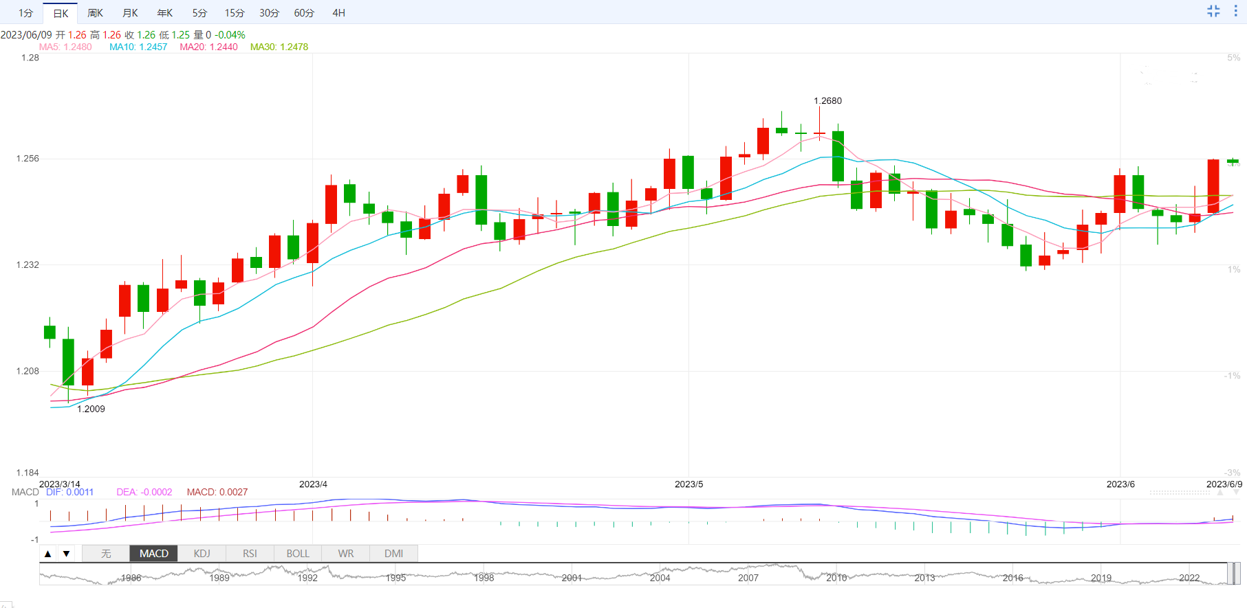 美元指数:截止发稿,美元指数上涨,现报103.40,涨幅0.07%。欧市盘前,美元指数受到美国经济数据低迷的影响,美元指数仍在103.30附近承压。值得注意的是,在美国联邦公开市场委员会货币政策会议即将召开之际,美国的统计数据不断打压美联储的鹰派,美元对6个主要货币的汇率指数在前一天出现了两个月来的最大跌幅。截至6月2日当周,美国首次申请失业救济人数上升至26.1万,预期为23.5万,前值为23.3万(修正后)。