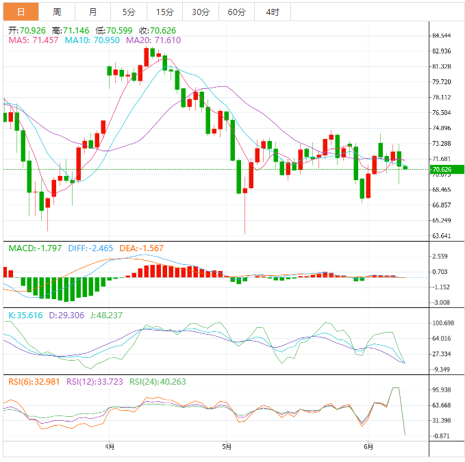 美原油目前下跌0.14%,交投于70.81美元/桶附近,周四收跌2.13%;布油目前下跌0.63%,交投于75.48美元/桶附近,周四收跌1.67%