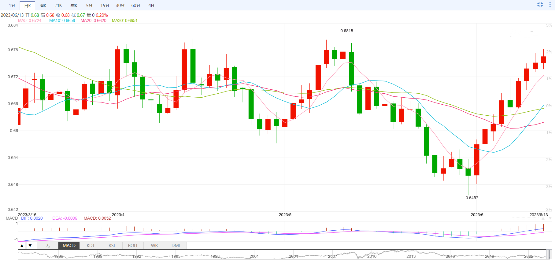 澳元/美元周二持平,展望本周美国的关键事件,首先是今天的消费者物价指数。美国5月通胀率将是一个关键的焦点,而美联储利率决议将在周三随后公佈,週一市场维持谨慎态度。预计美联储将自2022年1月以来首次维持利率不变。道明证券的分析师解释说,利率政策到了关键时刻,但我们维持长期以来的观点,即美联储将在6月最后加息25个基点,达到5.25%-5.50%的范围。