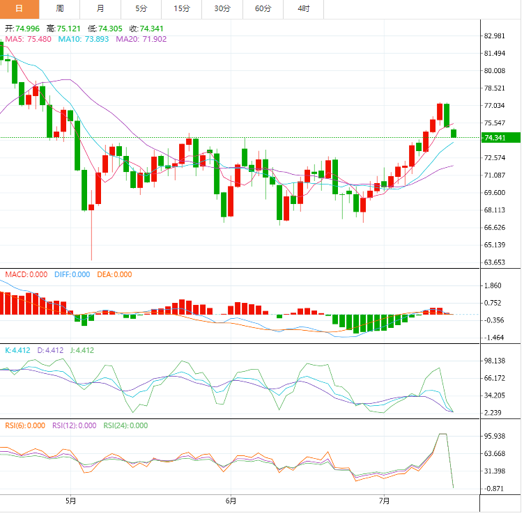 油价周一亚市延续跌势,美原油目前交投于74.71美元/桶,因利比亚油田周末恢复生产,尽管中国6月原油进口增加,但二季度GDP系列数据好坏参半,令多头仍有所顾忌。