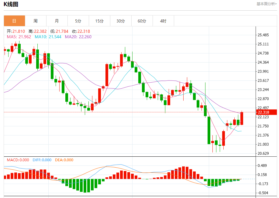 现货白银:截止北京时间20:24,现货白银上涨,现报22.313,涨幅2.36%。纽市盘前,白银价格显示出接近22.25水平的额外积极交易,通过深入查看图表,我们发现价格正在形成积极模式,其确认线位于上述障碍处,这意味着突破该障碍将促使价格直接反弹至23.00。