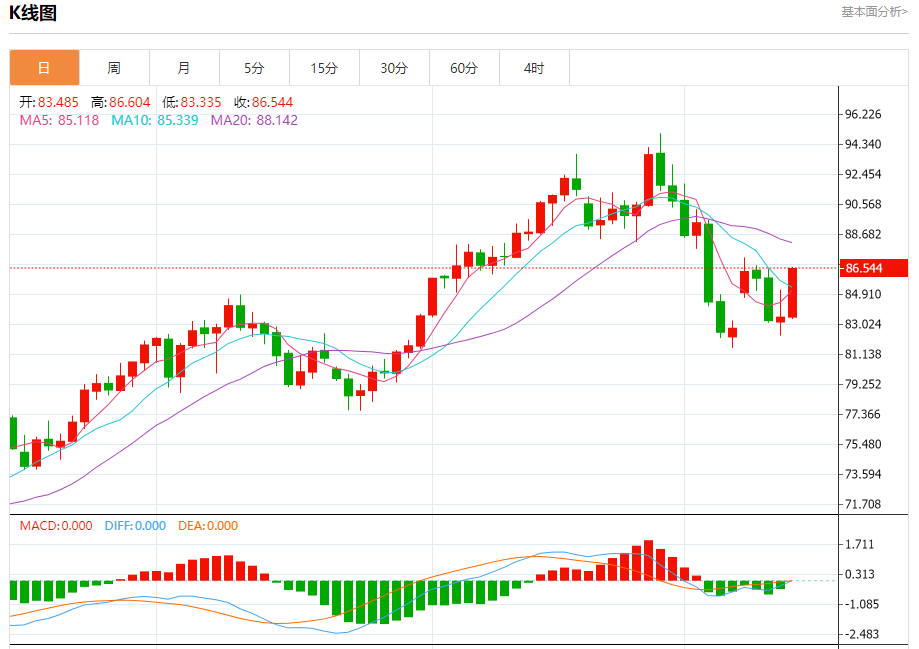 原油市场:截止北京时间20:24,美油上涨,现报86.505,涨幅3.61%。纽市盘前,原油价格强劲上涨,突破84.55水平,停止修正性熊市,走向复苏,并在未来一段时间内实现预期收益,因为积极目标从测试88.70开始。