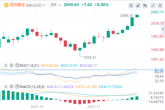 周三亚盘,黄金交投于2048.84附近。周二,美联储理事克里斯托弗-沃勒指出,只要通胀率继续回落至美联储目标,就没有理由继续迫使利率在更长时间内维持在较高水平。沃勒在与美国企业研究所(AmericanEnterpriseInstitute)经济政策研究主任迈克尔-斯特恩(MichaelStrain)的谈话中即兴发表的这一言论,引发了美国市场的风险买盘,使得黄金、股票和风险资产攀升,而美元则下跌。美联储官员讲话引发了市场对美联储将从“更长期维持更高水平利率”的利率立场转向政策将出现调整的押注,增加了市场对美联储宁愿提前降息的前景。