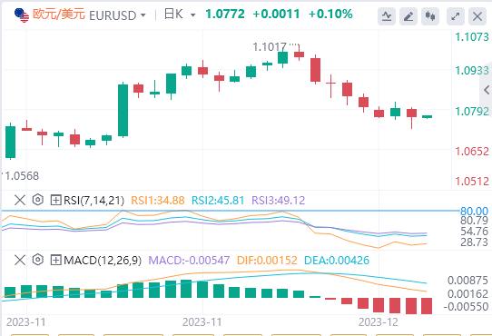 美元指数:截止发稿,美元指数交投于103.96附近。美国10月的通胀数据温和,助长了对美联储11月初立场的鸽派预期。然而,美联储官员考虑进一步紧缩的信号正在抑制这些预期,强劲的劳动力市场数据重申了该行的这一谨慎立场,该行要求提供经济降温的进一步证据。即将公布的11月通胀数据和下周的美联储会议将是美元短期走势的关键决定因素。技术面上,日线图上的指标反映了美元的短期矛盾格局。RSI的位置处于正斜率,尽管处于负值区域。这标志着购买势头不断增强,但还不足以带来决定性的复苏。另一方面,MACD指标的直方图用绿色条描绘了类似的画面,这表明抛售压力正在下降。