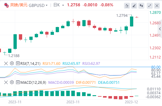 英国央行(BoE)在今年最后一次政策会议后将政策利率维持在5.25%。货币政策委员会(MPC)的三名成员MeganGreene、JonathanHaskel和CatherineMann投票赞成加息25个基点。英国央行重申,货币政策可能需要在"较长一段时间内"保持限制性。英国央行行长安德鲁-贝利(AndrewBailey)在利率决议后发表的声明中表示,现在开始猜测降息还为时过早,并补充说,他们还不能说利率已经见顶。英镑/美元在英国央行决议后聚集了看涨势头,并升至8月下旬以来的最高水平1.2800附近。周五早些时候,该货币对出现了技术性修正,回撤至1.2750附近。