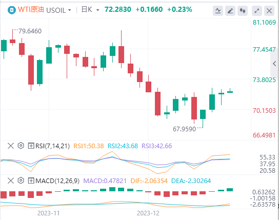 周一亚盘,原油交投于72.28附近。由于全球石油需求持续下降的速度快于石油输出国组织(OPEC)的减产速度,顶部涨幅仍然有限。欧佩克已宣布在2024年第一季度增加供应限制,但能源交易员仍对欧佩克能否成功抑制石油产量以满足飘忽不定的需求持怀疑态度。欧佩克目前无法强迫其成员国遵守自行设定的石油开采上限,也没有任何机制允许欧佩克惩罚炫耀每桶出口配额的成员国。