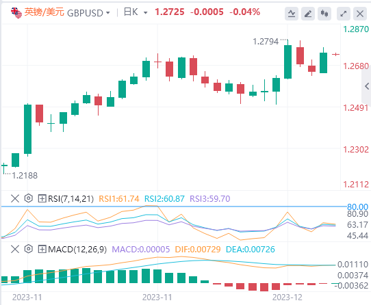 英镑:截止发稿,英镑/美元徘徊于1.2725附近。昨日英镑/美元上涨,收报1.2731,涨幅0.67%。英国央行的莎拉·布里登(Sarah Breeden)持鹰派立场,称政策“必须在很长一段时间内保持限制性”,并表示尽管经济朝着正确的方向发展,但“我们(英国央行)的工作还没有完成”。与此同时,路透社援引分析师的话说,上调了英镑/美元明年的涨幅。荷兰合作银行外汇策略主管Jane Foley评论说:“我们认为,从9到12个月的利差角度来看,英镑有上升至1.30的余地。技术面上,汇价上行的初步阻力位于1.2784,进一步阻力位于1.2839,关键阻力位于1.2917;汇价下行的初步支撑位于1.2652,进一步支撑位于1.2574,更关键支撑位于1.2519。