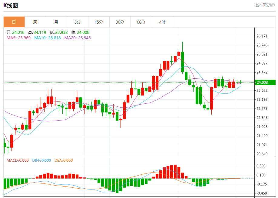 现货白银:截止北京时间21:20,现货白银下跌,现报24.016,跌幅0.04%。纽市盘前,自上午以来,白银价格没有表现出任何强劲的走势,因此,看涨趋势仍将有效,因为它今天没有任何变化,受到EMA50的支撑,等待访问24.60作为下一个主站,注意到突破23.70将停止预期的上涨,并推动价格转跌。
