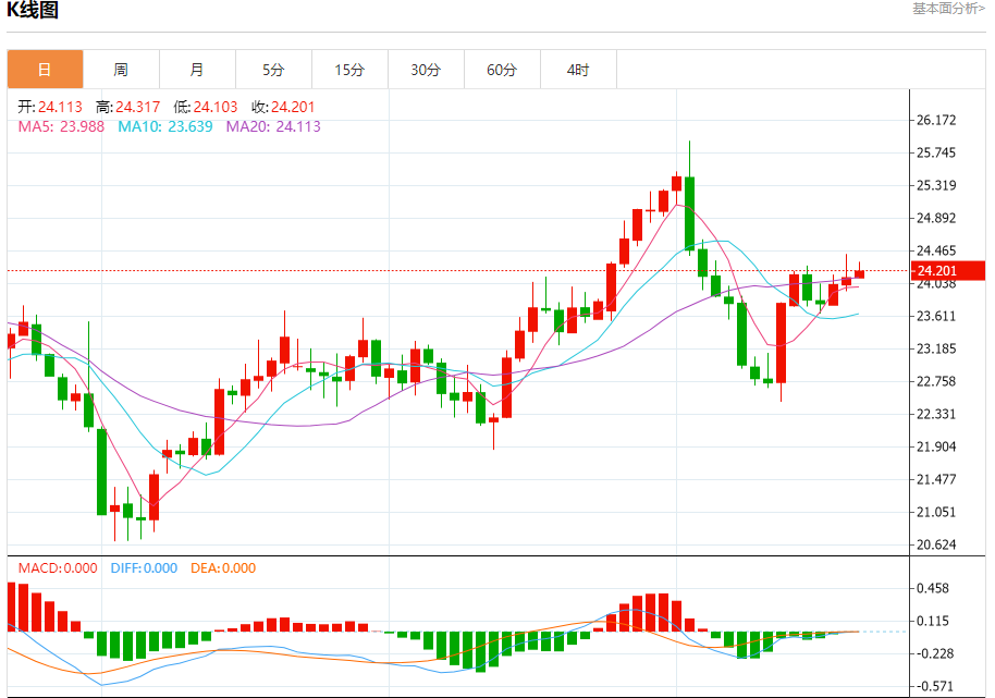 现货白银:截止北京时间21:20,现货白银下跌,现报24.211,涨幅0.39%。纽市盘前,自上午以来,白银价格稳定在24.20附近,只要价格高于23.70,我们的看涨观点就将保持有效,等待收集积极的动力,帮助推动价格达到我们的目标,即从24.60开始,在超过前一水平后延伸至25.50。