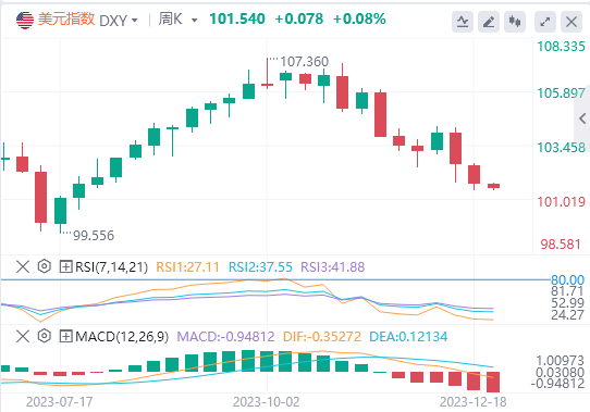 美元指数:截止发稿,美元指数交投于101.54附近。圣诞节后第二天,由于英国、澳大利亚、新西兰和香港等地市场仍处于公共假期,货币市场走势平静。许多美国交易员也在新年之前休假。由于美联储降息的预期削弱了美元相对于其他货币的吸引力,美元指数有望出现2020年以来最差表现。技术面上,美元指数正在经历上个季度最糟糕的一周之一。随着交易部门清理资产负债表,很明显,几位美元多头进一步解除了他们在美元的头寸。随着美国国债收益率的持续下跌,2023年的利差故事已经结束,市场将在2024年初进一步下跌。任何可能与降息押注或引发美元流入的地缘政治事件相矛盾的数据中任何乐观的意外,仍可能使美元指数走高。