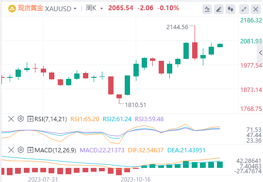 周三亚盘,黄金交投于2065.54附近。周三早盘,金价保持在2060美元以上。在交易量清淡的情况下,2023年的最后一周可能会很平静。美元兑其竞争对手普遍走软。与此同时,美元指数跌至7月以来的最低水平,接近101.45。美国国债收益率小幅走低,10年期国债收益率为3.89%。